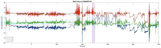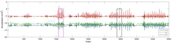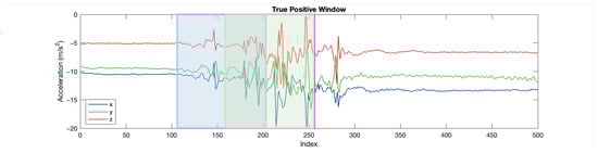 Figure 15 is an example data trace in FARSEEING. The magenta rectangular is the true positive (fall) window detected. Figure 16 is the excerpt around the true positive window (for 10 s). The blue and green rectangular represents the two sub-windows. In the first sub-window (in blue), the acceleration changes obviously, with an amplitude of about , but minor than that in the second sub-window. In the second sub-window (about ). This difference is consistent with our experience. The acceleration increases at the beginning of the fall, the speed of the body increases during the fall, and the speed becomes 0 at the moment of hitting the ground (the end of the fall), resulting in a greater acceleration at the end of the fall.