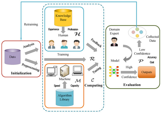 It is important to fuse human cognitive reasoning and intelligent machine computing for subtasks and collaborating in a complementary way. Our proposed framework is illustrated in Figure 2. The framework contains three parts. (1) The first part is initialization, in which data are prepared to be computed for a certain task. At this stage, both humans and machines would perform a few tasks (human analysis and/or machine preprocessing, such as data cleaning, basic model training, and special sample collection). (2) The second part is the computing part; here, the machine selects a specific algorithm from the algorithm library, whereas the human has a knowledge base. The model is run in an iterative way until a predefined threshold is met or budgets are exhausted. (3) The third part is an evaluation part that evaluates the efficiency of human–machine learning. Furthermore, the most important thing is that a proportion of the low-confidence data will be collected for further training in an iterative pattern. The collected samples are mainly hard ones, such as are heavily shielded crowds or someone that is not clear, but in the same dressing style similar to the target.