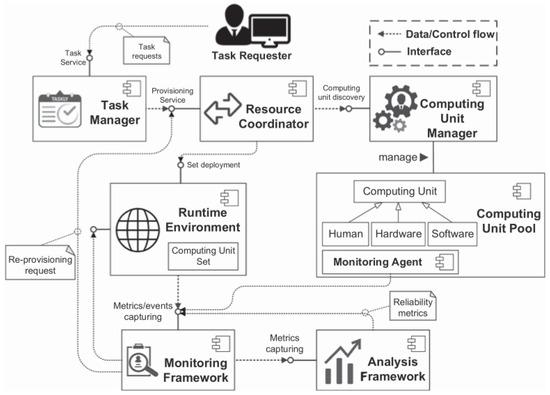 In this section, we design basic rules for the framework to ensure that it can work smoothly as often as possible, mainly referring to the task allocation mechanism and conflict resolution to address human and machine judgements. Furthermore, model adjusting based on human feedback is a vital issue to be addressed. The workflow of the framework runtime is shown in Figure 3. The runtime starts when a new task arrives and the task requester sends messages to the task manager, which is responsible for constructing a queue to be processed. The prepared request is then delivered to the resource coordinator, who is responsible for assembling a set of computing units. Potential computing units are selected by a computing unit manager. All of the computing units are virtualized in a computing unit pool to be chosen by the computing unit manager. Similarly to the computing unit manager, runtime environments are deployed to certain tasks. The monitoring framework through an interactive interface provides the current state of the process. Finally, the analysis framework displays critical performance metrics. With a clear operational process in place, the task can be executed effectively. Depending on the application (and the research groups), different abstractions and solutions will be used [37].