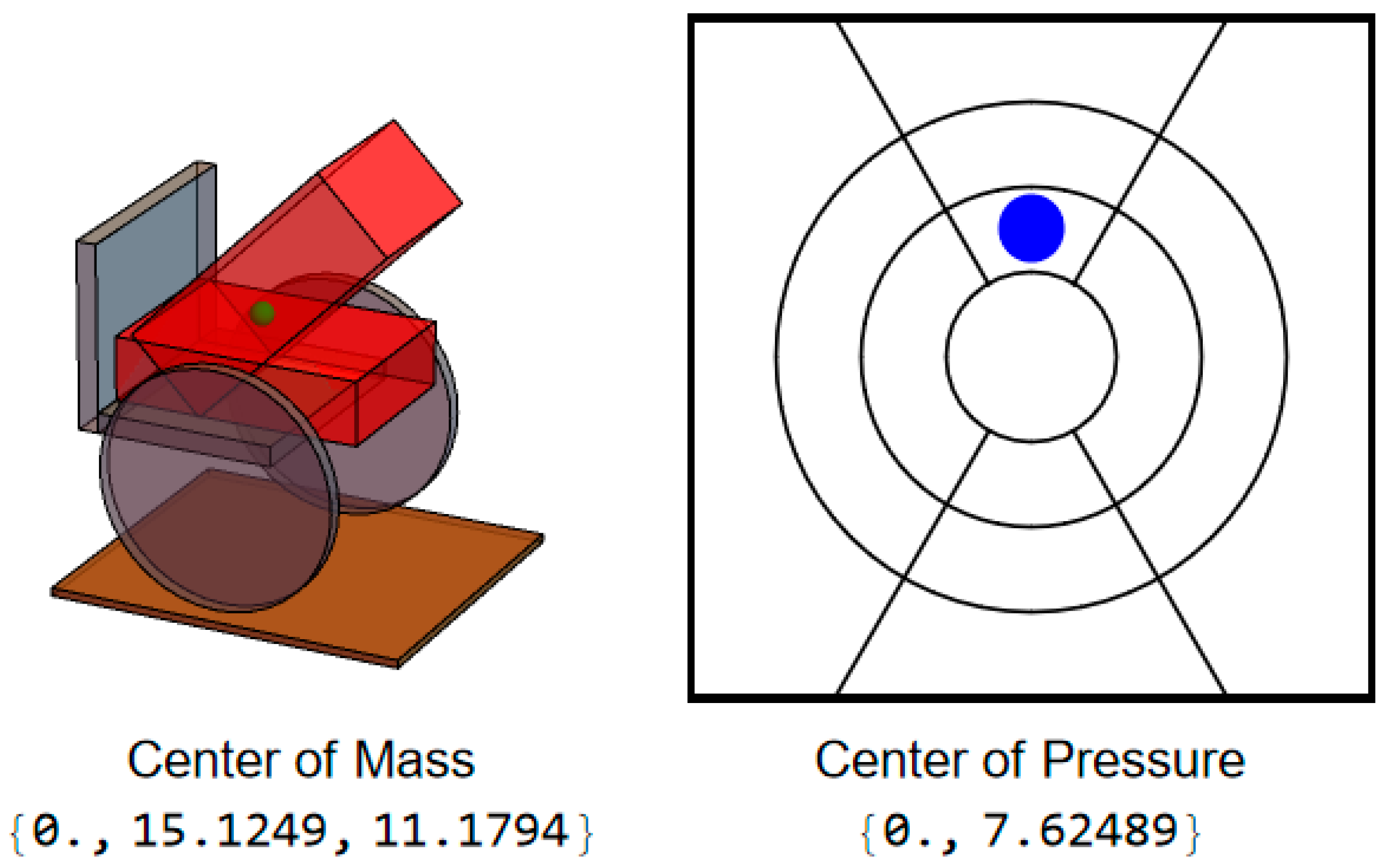 The CoP of the user on the wheelchair’s seat is the projection of the user’s center of mass (CoM) along the gravity vector where it intersects the seating surface. If the wheelchair is on level ground, the CoP is at the point on the wheelchair’s seat that is directly below the CoM. For the purposes of relating seated posture with CoP, the most basic model can represent the wheelchair user as consisting of three segments—trunk, upper legs, and lower legs—connected by hinged joints. The user’s CoM is simply the superposition of the CoMs of these three segments (