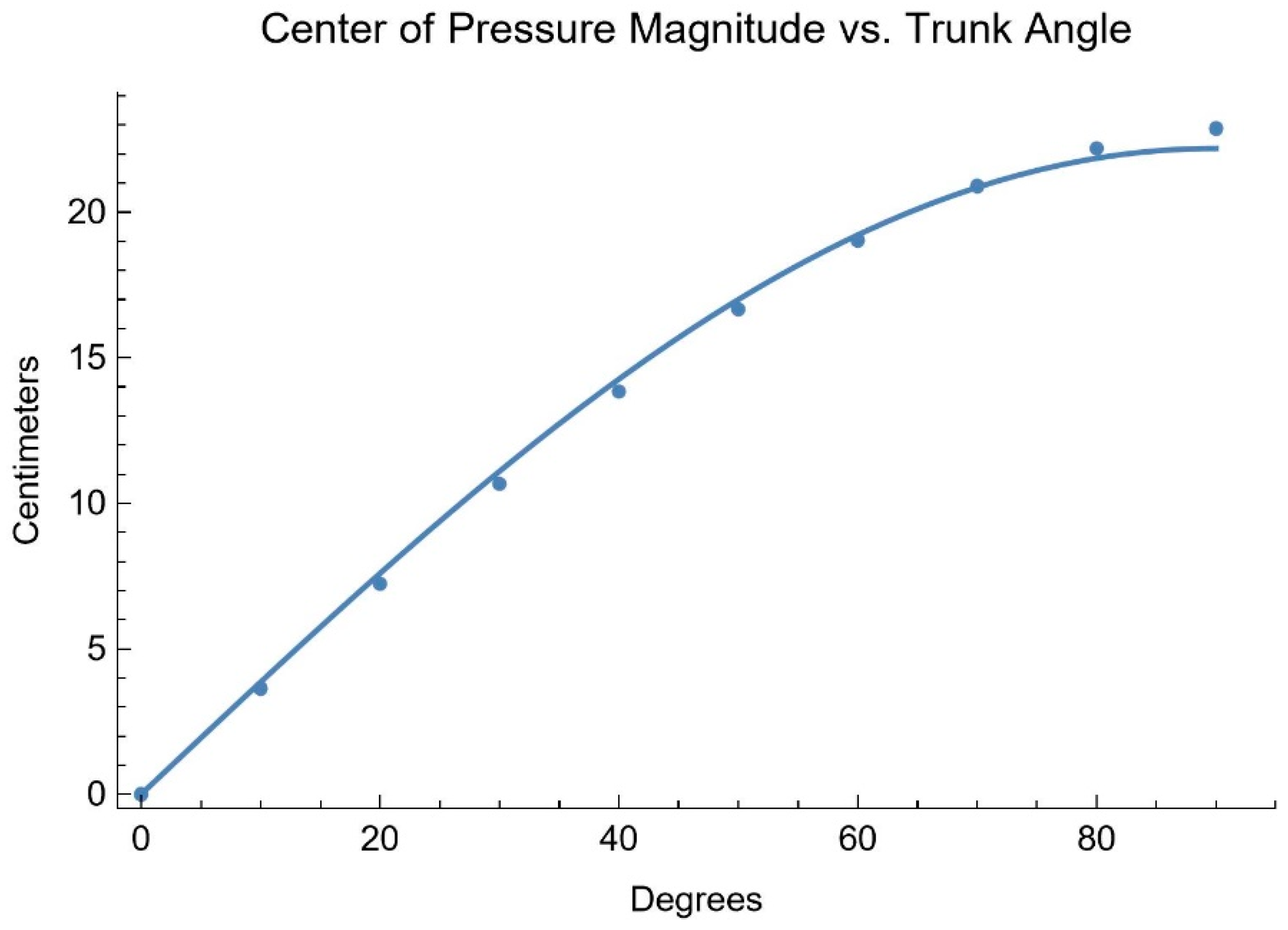 Based on the mathematical model, CoP magnitude versus trunk angle data should fit Equation (11).