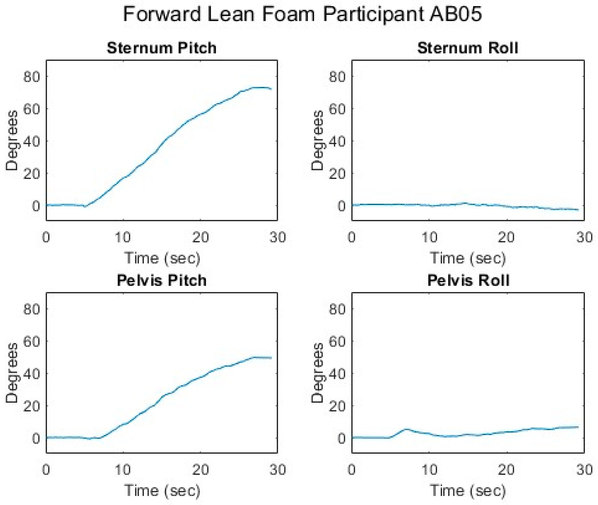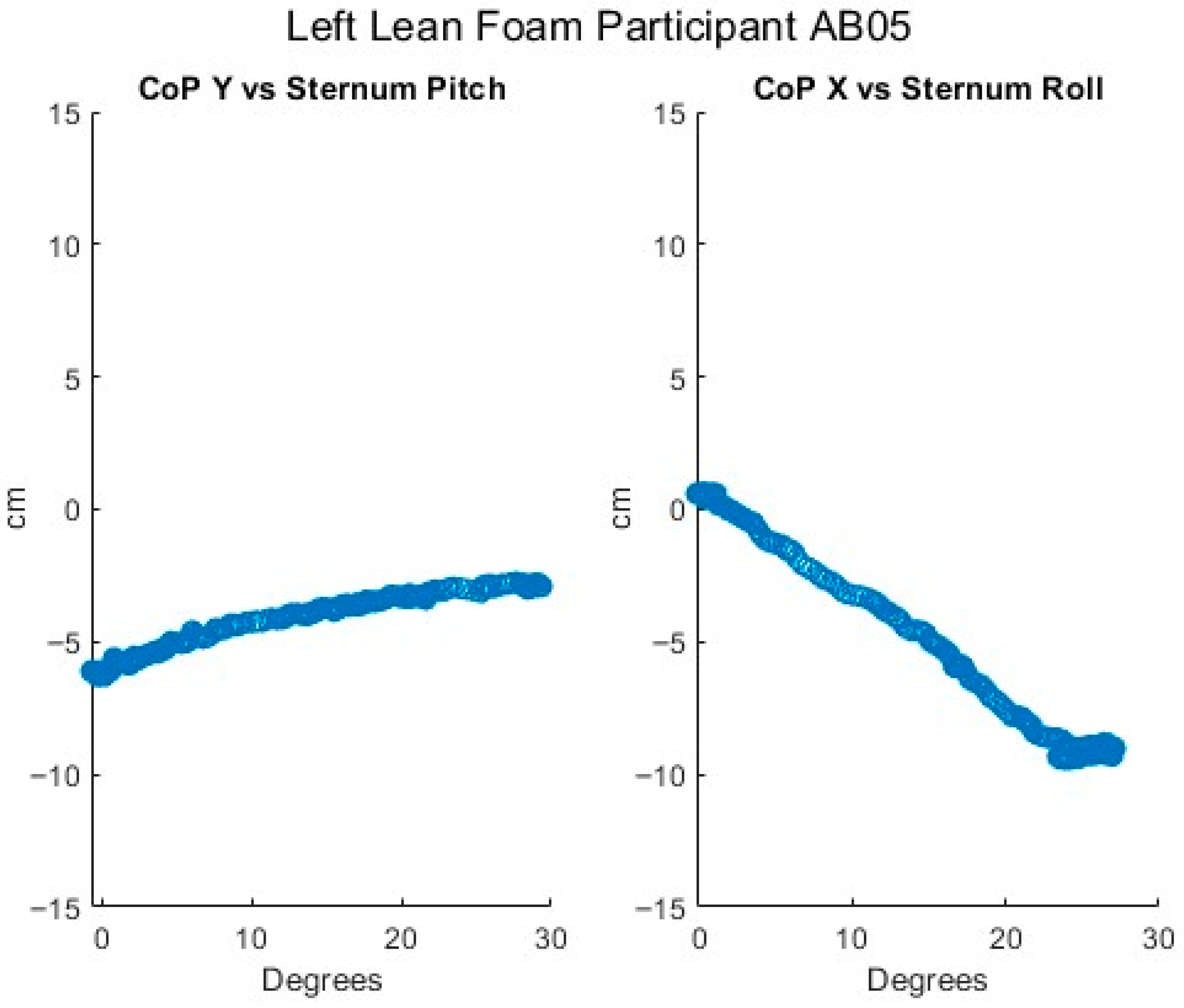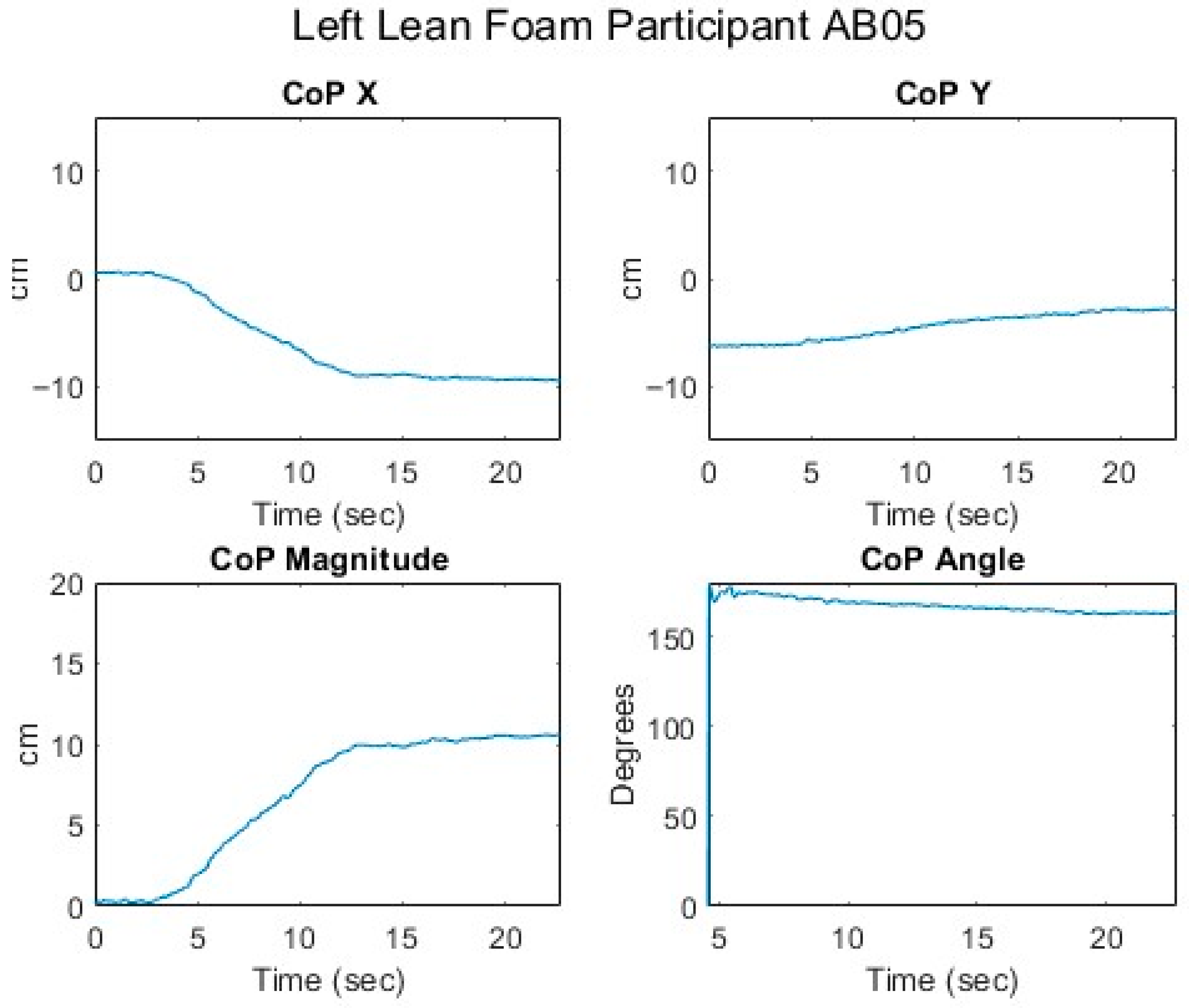 The start time from each test’s load cell file and IMU sample rate were used to generate timestamps for the IMU data. For initial data analysis, the means of the first half-second of data for each test were used to calculate the zeros from which angle changes were measured, the starting point of the CoP vector, and the mean pressures under each IT against which proportional pressures were measured. As the pressure mat had the lowest sample rate, its timestamps were used to find the closest measurements from the load cells and IMUs for each pressure mat measurement. The maximum time difference between corresponding samples from the different measurement systems was less than 5 ms. The synchronized data was then used to graph the results for each participant for each test.
