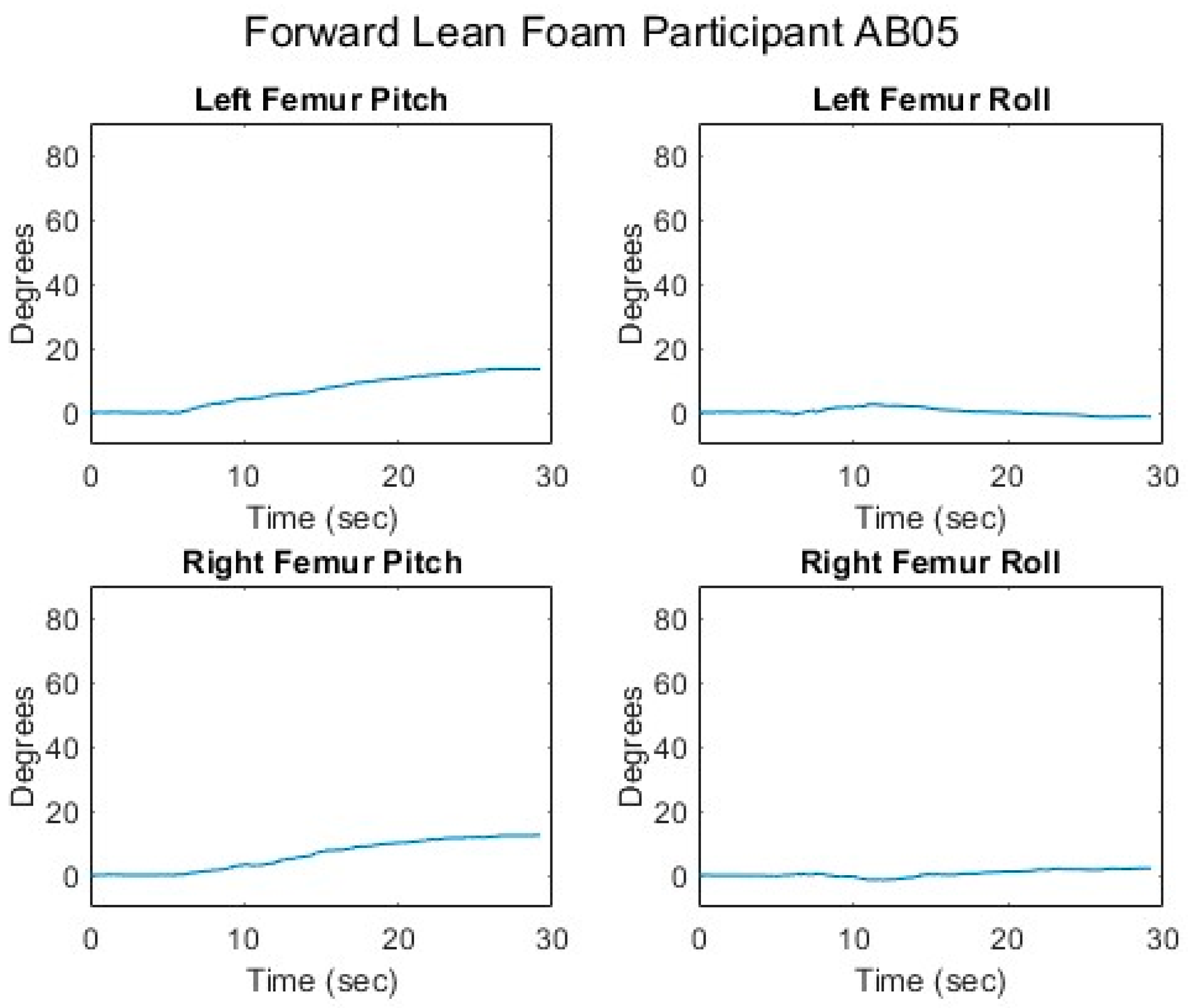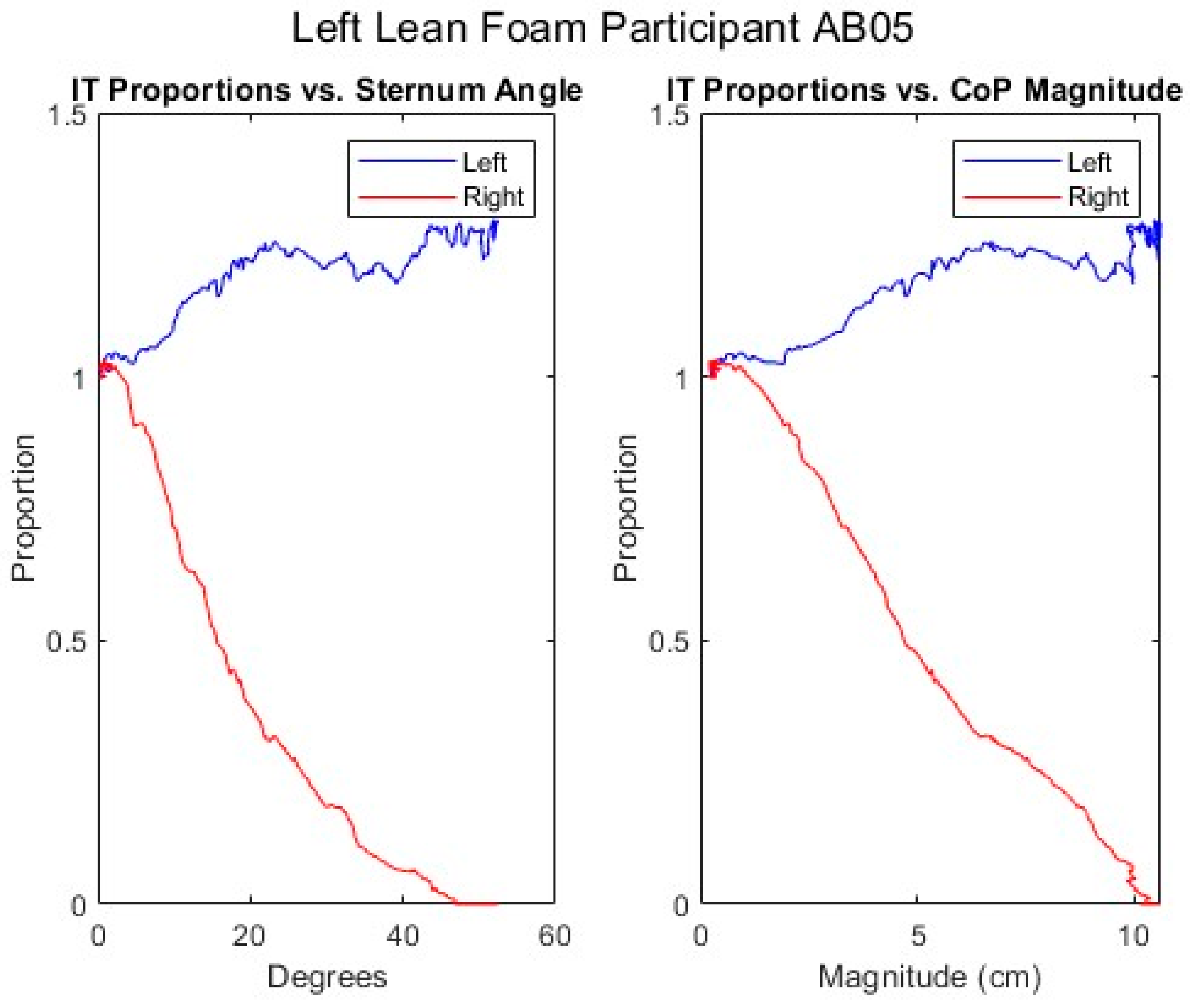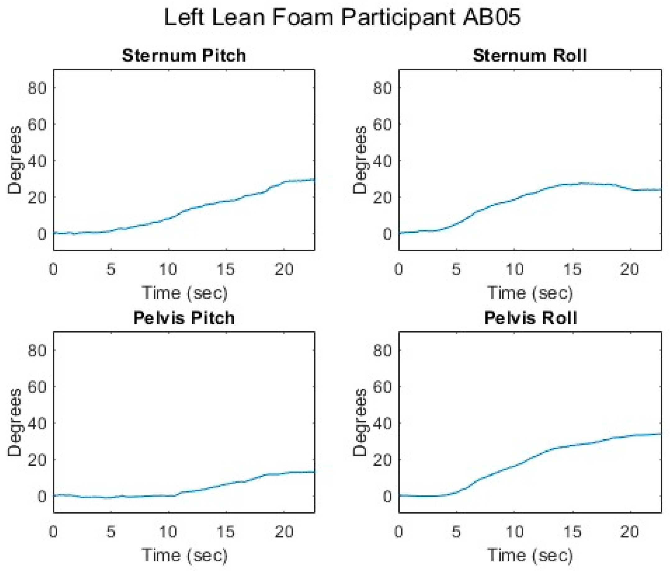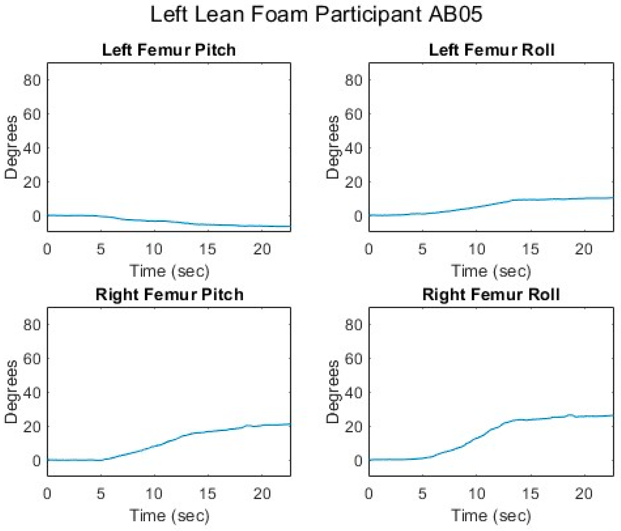 The start time from each test’s load cell file and IMU sample rate were used to generate timestamps for the IMU data. For initial data analysis, the means of the first half-second of data for each test were used to calculate the zeros from which angle changes were measured, the starting point of the CoP vector, and the mean pressures under each IT against which proportional pressures were measured. As the pressure mat had the lowest sample rate, its timestamps were used to find the closest measurements from the load cells and IMUs for each pressure mat measurement. The maximum time difference between corresponding samples from the different measurement systems was less than 5 ms. The synchronized data was then used to graph the results for each participant for each test.