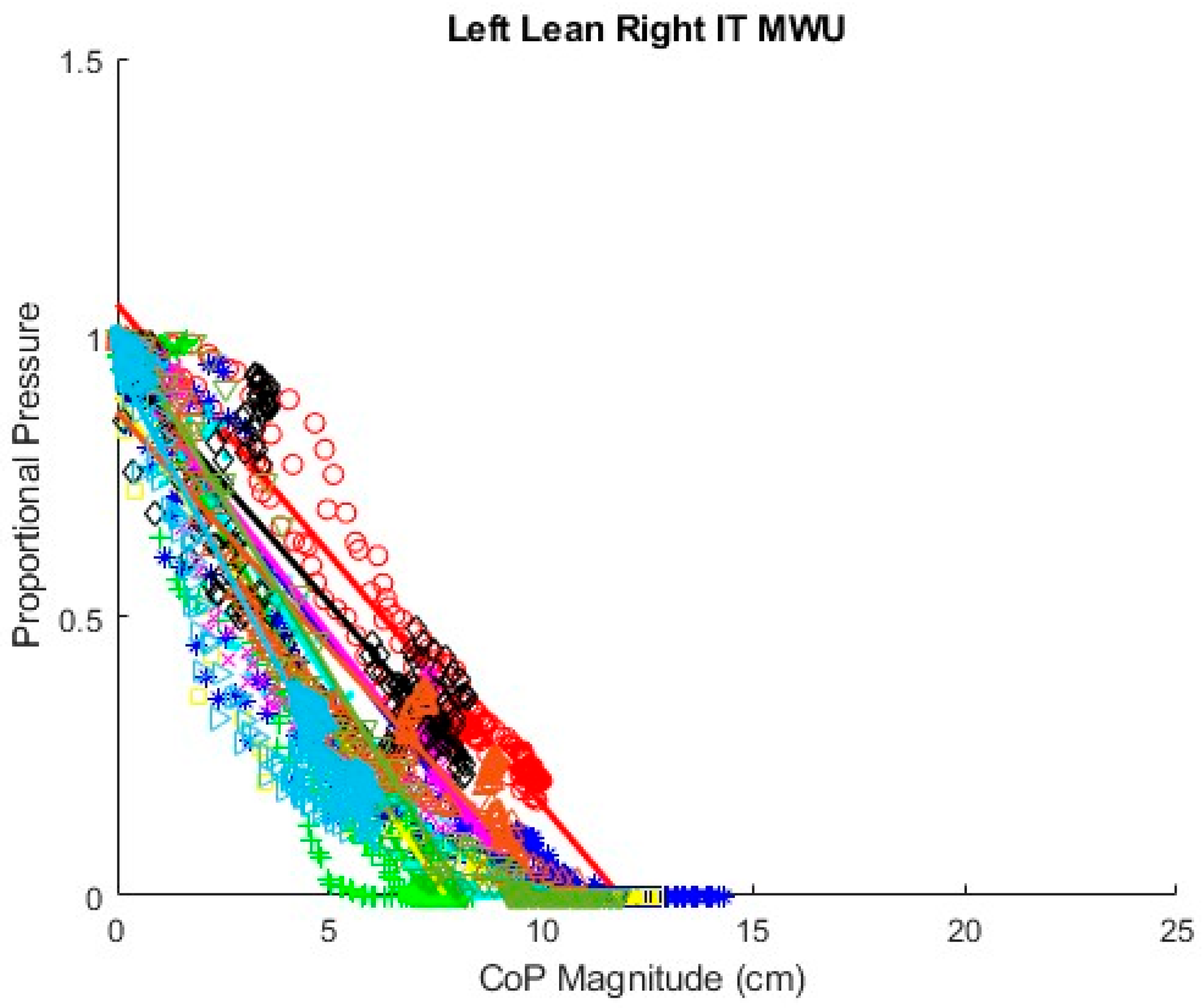 The linear models for AB and MWU participants, calculated independently, show a slightly (11%) greater magnitude for the estimate of CoP for MWU compared to AB participants, but both estimates were well within each other’s confidence limits and therefore not statistically different. In both models, the estimates for the interactions of CoP by PR Left and CoP by PR Right were at least 43% of the magnitude of the CoP estimate, which makes these effects practically significant in addition to their p values indicating statistical significance. For both groups, leaning to either side required less change in CoP magnitude than did leaning forward to achieve the same reduction in proportional SIP. The interaction effect of a leftward lean for the MWU participants (−0.0333) is very similar to that for both leftward (−0.0307) and rightward (−0.0297) leaning PR for AB participants, while that for a rightward PR (−0.0615) is notably larger. The confidence interval for the MWU rightward PR is also wider. The greater variation may be due to an asymmetrical lack of trunk control for some MWU participants.