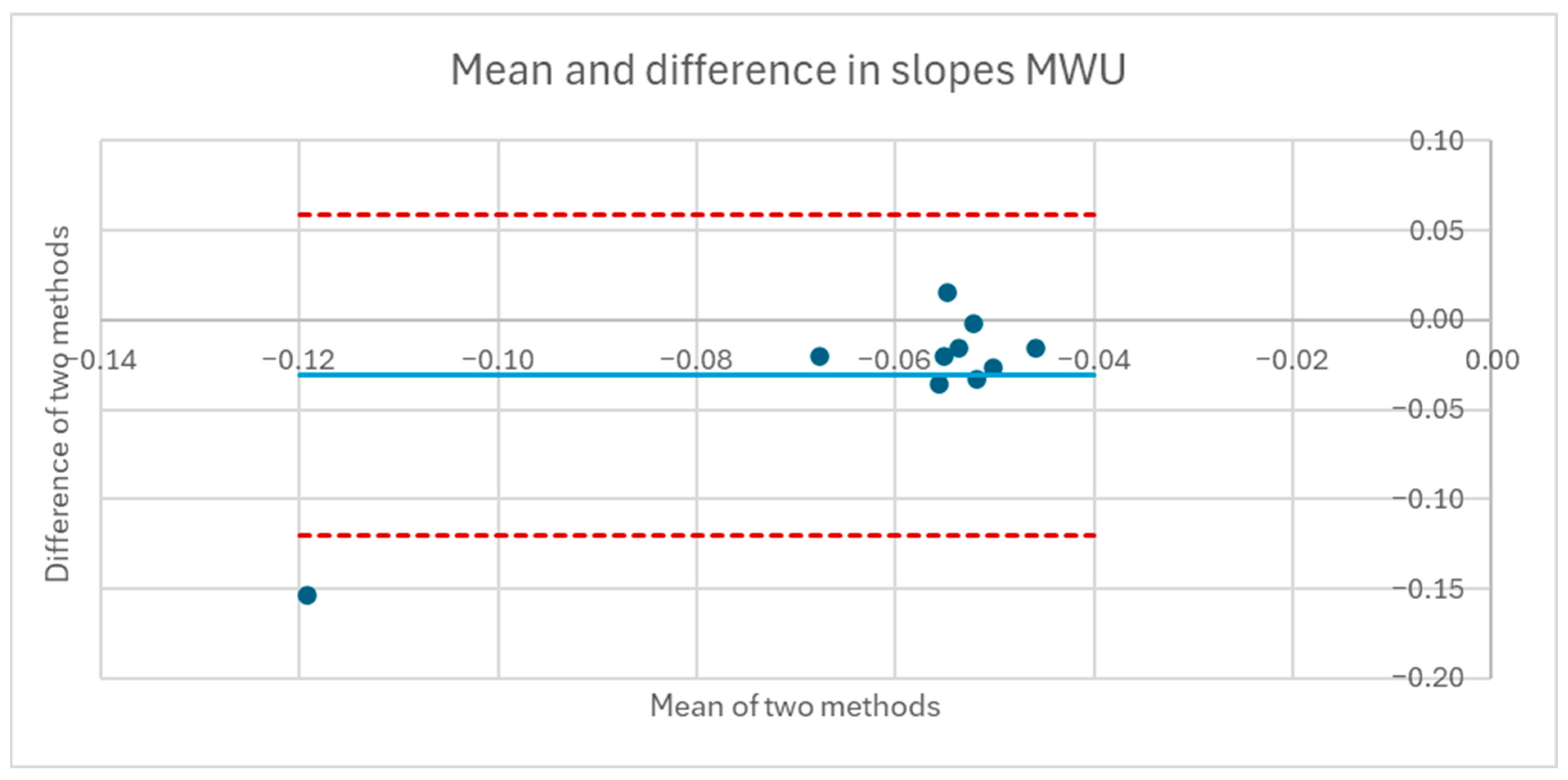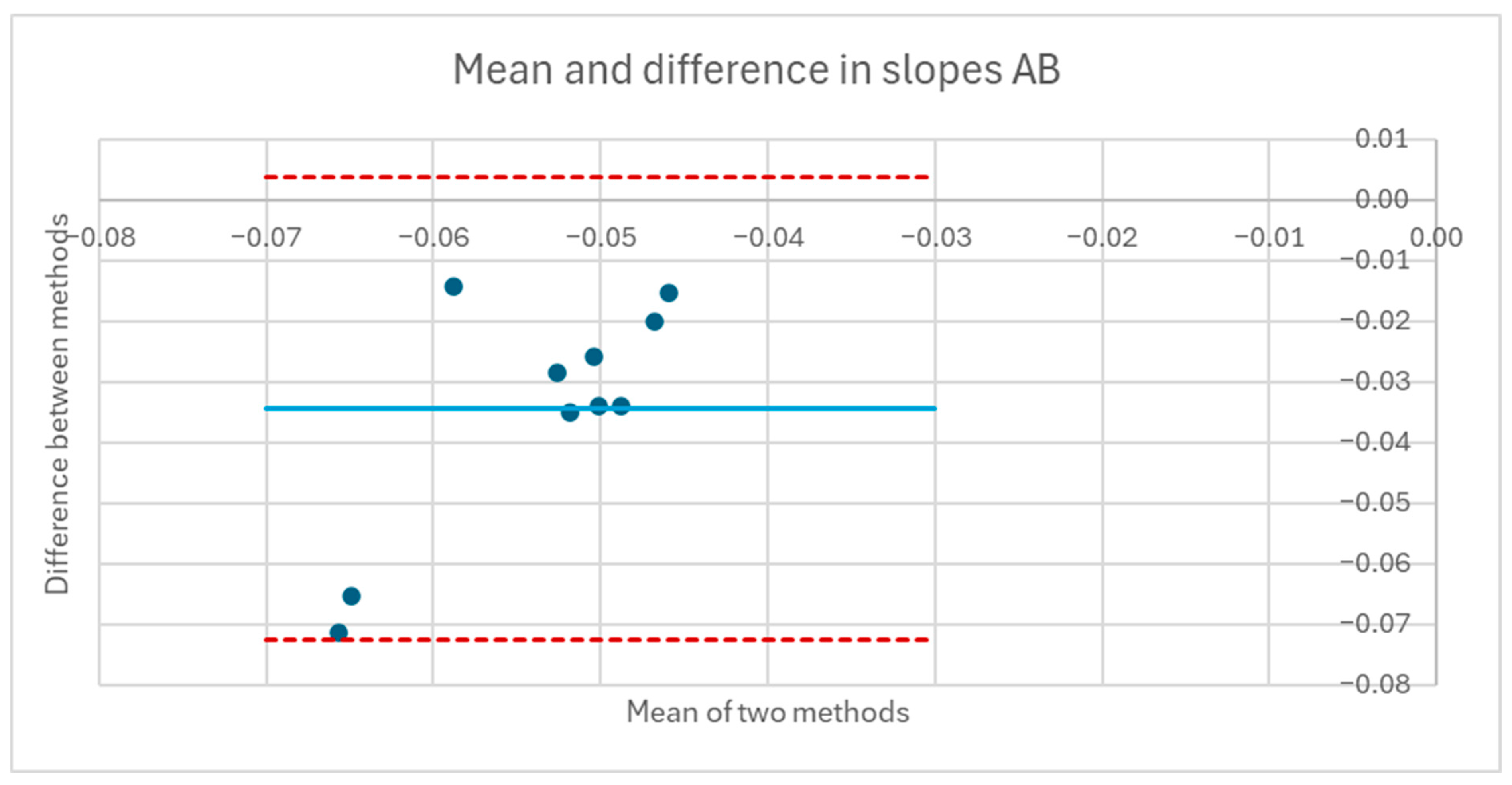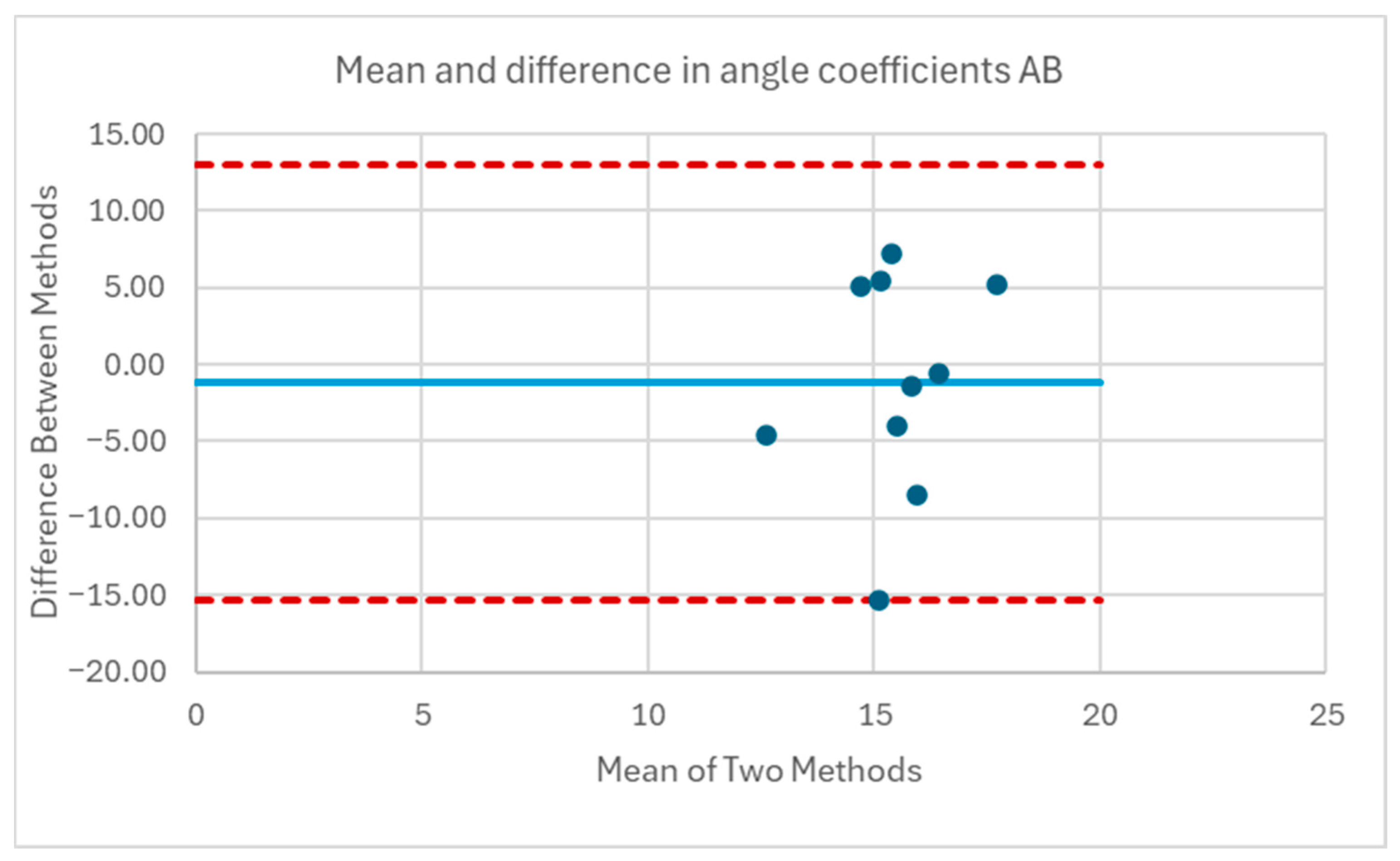 For each experimental condition—e.g., foam cushion–backrest starting position–forward lean—a regression line was fitted to the combined data from the 3 repeated trials for each participant, which provided the relationship between CoP magnitude and proportional pressure. To exclude the extreme ends of the leans where the response becomes nonlinear and reaches a plateau on some trials, only data from the first 95% of the SIP reduction was included. For the AB participants, regression lines were also fitted for the combined forward lean data, i.e., both cushion types and both starting positions. Participant body segment measurements were used in the equation for the mathematical model to calculate the expected slopes for forward leans for comparison. Bland–Altman plots were constructed comparing the difference between fitted and theoretical slopes to determine whether they varied in any systematic way.