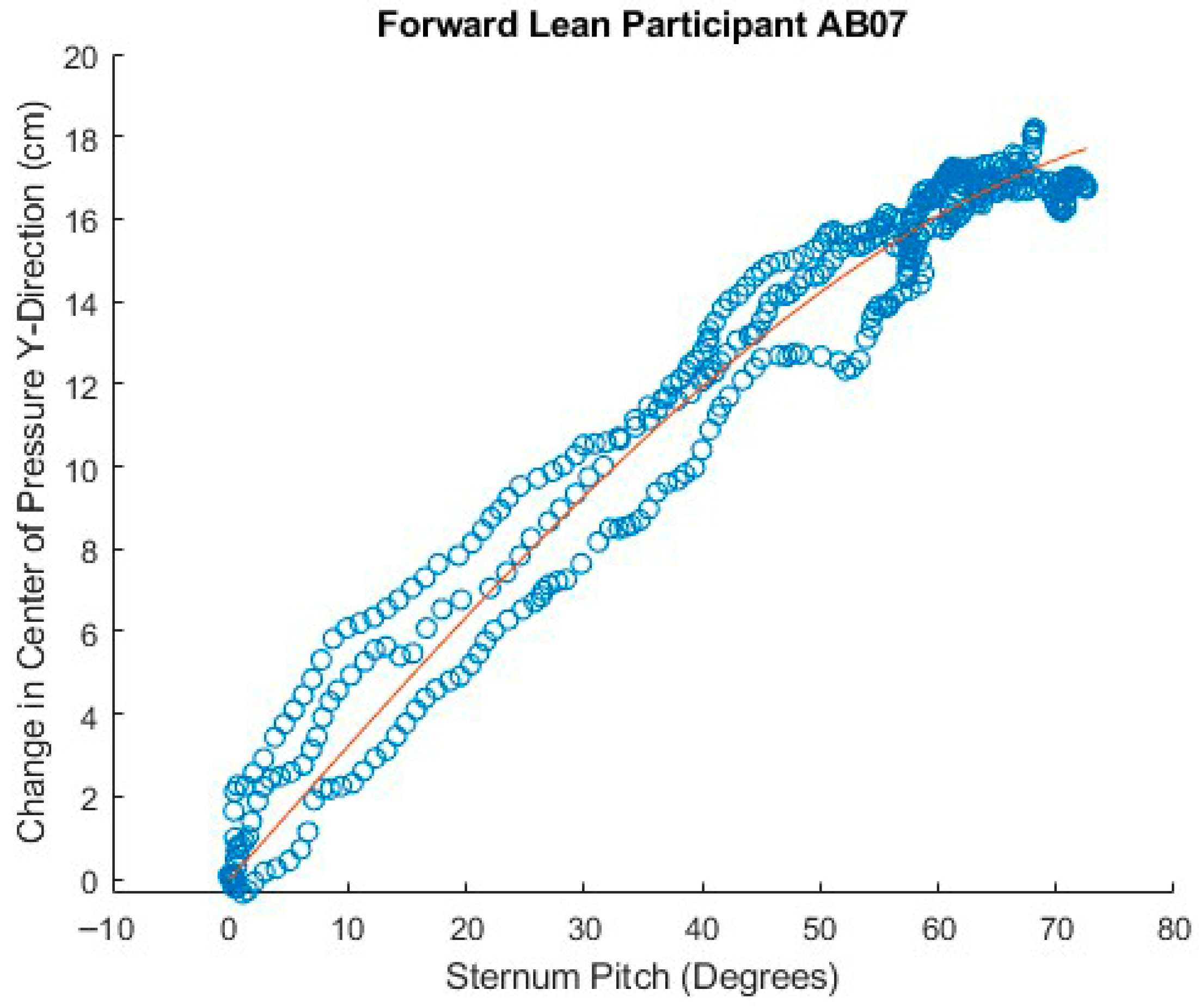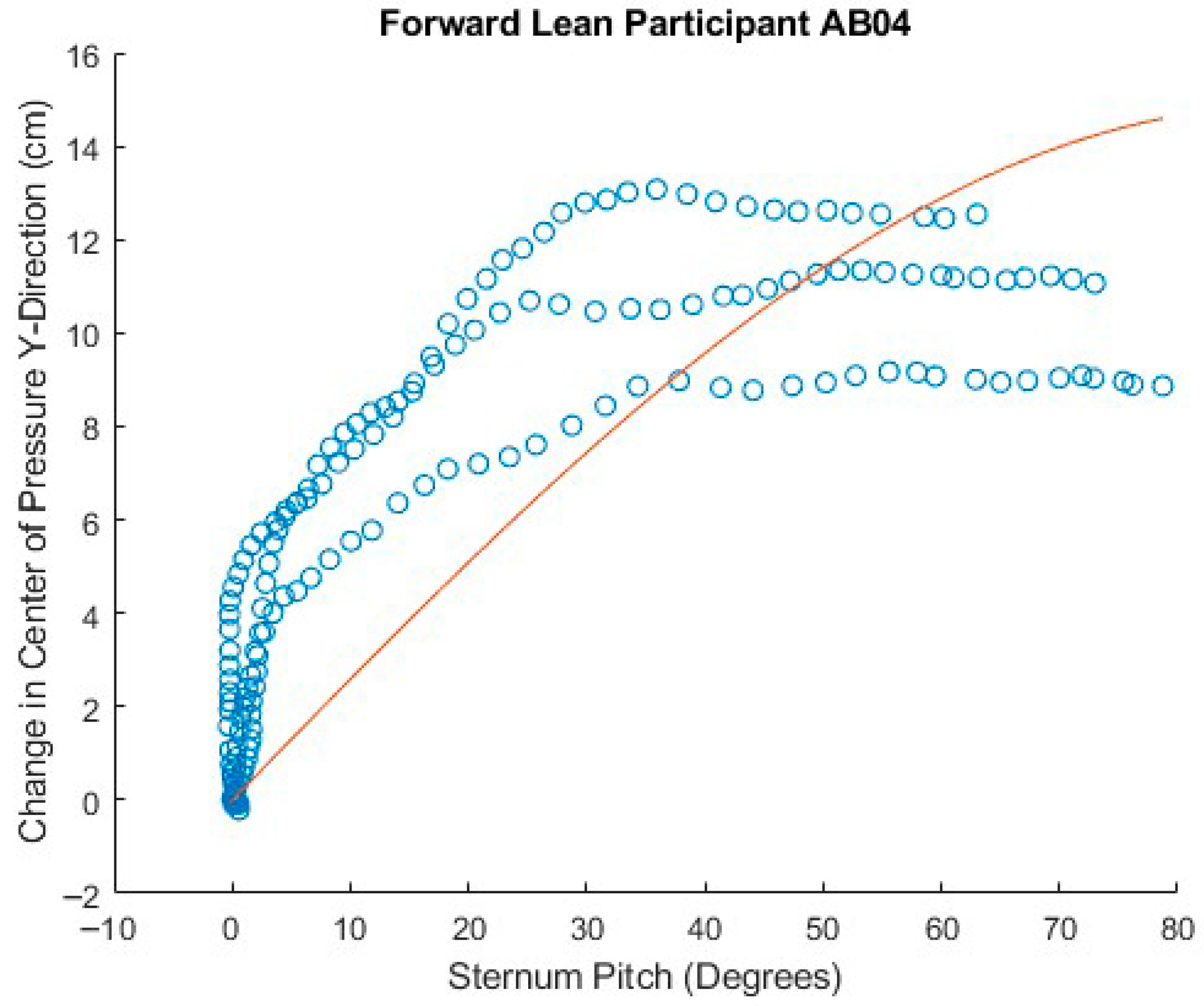 The data for sternum pitch and change in CoP generally showed a poorer fit to the predicted equation than did the data for SIP and CoP magnitude. The simple model assumes a rigid trunk segment connected to a stationary upper legs segment with just a hinged joint. If there is some curvature to the spine as the participant leans forward, considering only the sternum pitch will overestimate the change in CoP. However, a model that included a linear combination of sine functions for the sternum and pelvis pitches (not presented) did not provide a better fit to the data. Supporting any amount of the torso weight through hands resting on the knees or wheelchair frame would also change the relationship between the sternum pitch and the change in CoP. These observations suggest that estimates of trunk angle—whether measured by body-worn sensors, motion-tracking cameras, or clinician observation—may not provide good estimates of SIP reduction. During some of the tests, it was noted, and observation of the collected data corroborates, that the XSENS sensors may have moved during the leans, making the angle data less reliable. In addition, in several trials, it appears that the angle data was not properly time-aligned despite the trigger. Given this poor fit for the simple forward lean model and that the angle relationship is not directly applicable to the development of the real-time pressure relief algorithm for the load cell-based system, no further model fitting was attempted with the XSENS data.