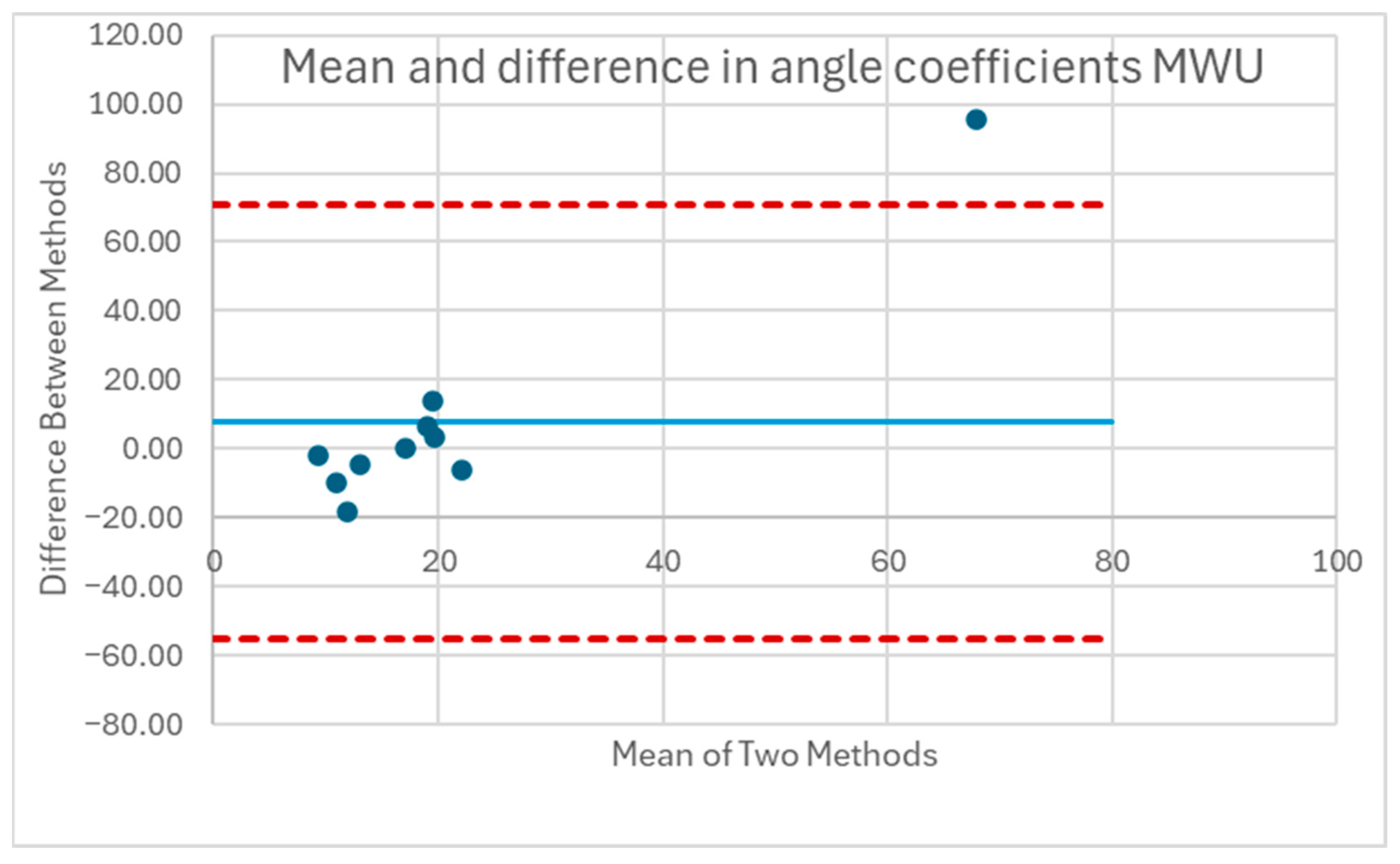 Most other data analysis was performed in MATLAB R 2024b (The MathWorks, Natick, MA, USA). Analysis of linear models was performed in R Studio 2025 (Posit, Boston, MA, USA). Bland–Altman plots were generated in Microsoft Excel (Microsoft Corporation, Redmond, WA, USA). For each combination of participant–cushion–starting position, the wheelchair pressure mat data was imported, and the timestamps from the load cell files were used to segment each test. To define the area under each IT, a heat map was generated from the static sitting test and the indices of the 4 contiguous cells of highest pressure in the area of each IT were recorded. In those cases where more than 4 cells had high pressures, the first forward-leaning PR test was used to identify the areas where the pressures stayed high the longest. In the subsequent analysis, the pressure measurements of the 4 cells were averaged and that value was taken as the pressure under the corresponding IT. Load cell measurements taken at the beginning of each test series before the participant had transferred to the wheelchair were used to subtract the weight of the cushion plus pressure mat so that the load cells only measured participant weight distribution.