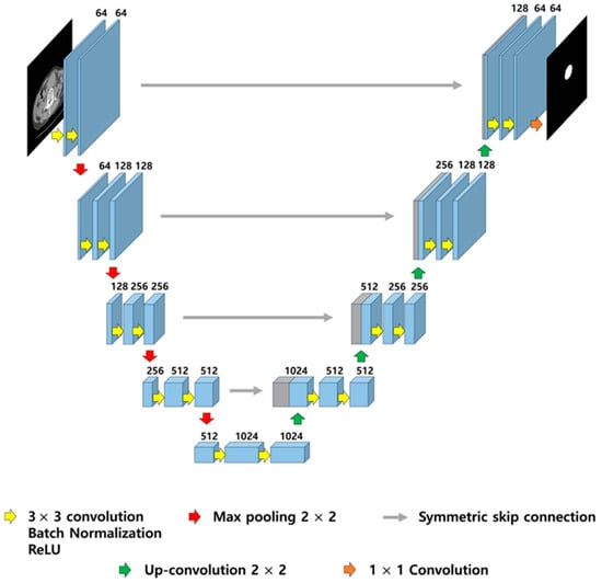 Illustration of U-Net architecture. The model consists of a contracting path (left) for feature extraction and an expansive path (right) for precise localization, connected by symmetric skip connections to preserve spatial resolution. Each block includes 3 × 3 convolutions with batch normalization and ReLU activation, followed by 2 × 2 max pooling or up-convolution.