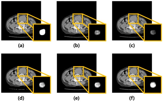 Poisson–Gaussian noise was added to CT images of AAA using MATLAB. Subsequently, the average, median, Wiener filters, and MMWF were modeled and applied. Figure 2 shows the corresponding images. Figure 2a presents the original CT image of an AAA, while Figure 2b shows the image after noise addition. Figure 2c–f show the results after applying the average, median, Wiener, and MMWF filters, respectively. The bottom-right inset in each filtered image represents the corresponding U-Net segmentation output.