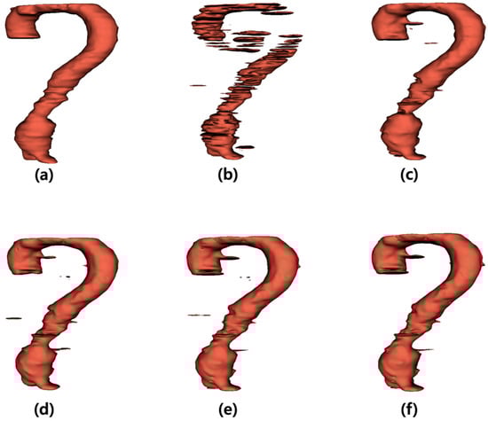 The output images generated by the U-Net were summed along the z-axis to construct three-dimensional (3D) models (Figure 3). Figure 3a illustrates the 3D model of the label data, and Figure 3b presents the 3D reconstruction of the output derived from the noisy input image. Figure 3c–f shows the 3D models of the output images obtained from the inputs processed with the average, median, Wiener, and MMWF filters, respectively.