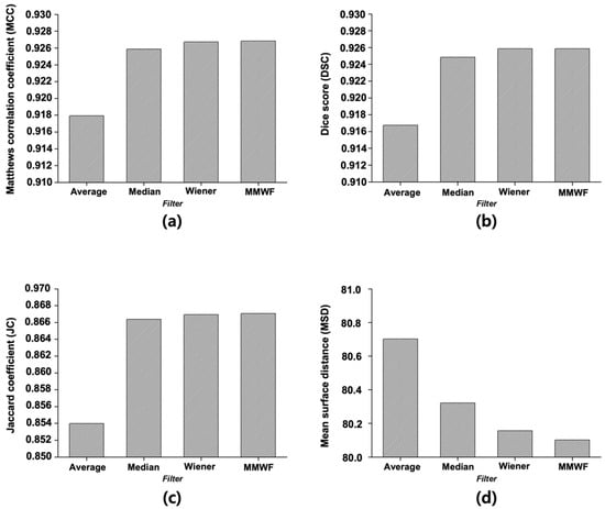 Quantitative evaluation of segmentation results using different denoising filters based on four performance metrics: (a) Matthews correlation coefficient, (b) Dice score, (c) Jaccard coefficient, and (d) Mean surface distance. Each metric was calculated to assess the accuracy and structural consistency of the U-Net segmentation outputs. Filters compared include average, median, Wiener, and median-modified Wiener filters.