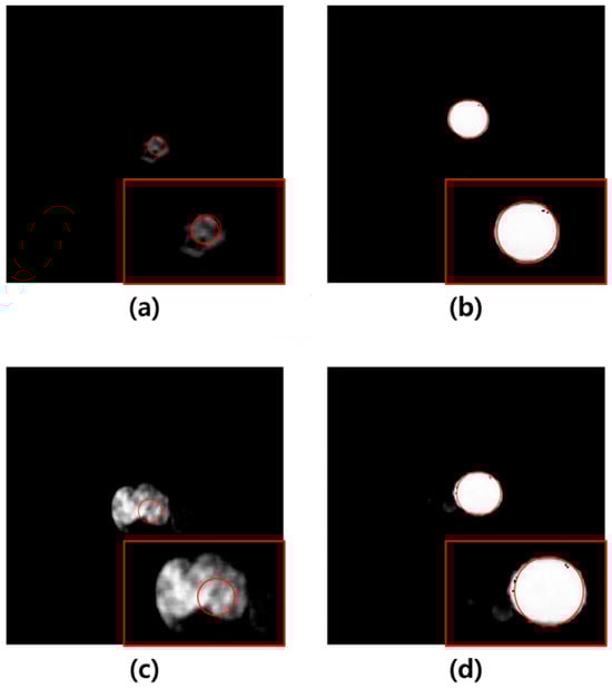 (a) Example of a medium-risk case misclassified as low-risk in a noisy image. (b) Example of a medium-risk case correctly classified in an image preprocessed with the MMWF filter. (c) Example of a high-risk case misclassified as medium-risk in a noisy image. (d) Example of a high-risk case correctly classified in an image preprocessed with the MMWF filter. In each image, the red box shows a magnified view of the segmented abdominal aortic aneurysm, and the red circle indicates the boundary detected by the Hough circle algorithm, which is used for risk classification based on diameter.
