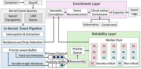 Overall, this workflow demonstrates how in-kernel capture, priority-aware buffering, explicit loss detection, and user-space enrichment combine to provide high-throughput, context-rich monitoring that delivers greater reliability, scalability, and observability while remaining robust under dynamic and large-scale cloud-native workloads.