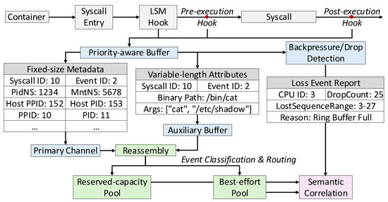 The workflow can be illustrated using the execve system call. When invoked, both the system call tracepoint and the security_bprm_check LSM hook are triggered. At this point, fixed-size metadata, including system call identifiers, process IDs, and Linux namespace information, is batched into the ring buffer, while variable-length attributes such as binary paths and arguments are collected in parallel and stored in the auxiliary channel, linked via event identifiers. Events classified as high priority are directed to a reserved buffer to guarantee delivery even under overload, ensuring that essential execution information remains available. Low-priority events may be discarded if necessary to maintain throughput and prevent system-wide slowdowns. Whenever drops occur, per-CPU counters and embedded sequence numbers allow the user-space collector to quantify the exact scope and timing of data loss, attributing it to overload rather than silent failures. After transmission, the collector reconstructs complete events by joining metadata with associated attributes and enriches them with container runtime information to map processes to pods, containers, and namespaces. This enriched view bridges low-level kernel activity with high-level workload abstractions, allowing operators to correlate runtime behavior with orchestration-level entities.