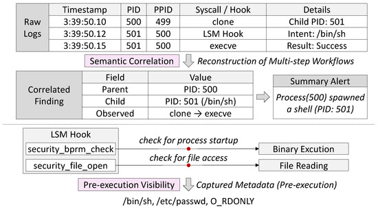 Raw event capture alone cannot expose the higher-order relationships that reveal complex behaviors. As illustrated in Figure 3, Aquila extends observability by incorporating mechanisms that correlate system calls into multi-step workflows and by leveraging pre-execution LSM hooks that expose kernel activity before it is finalized.