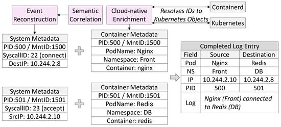 For monitoring to be effective in cloud-native deployments, kernel-level events must be projected into abstractions that reflect the way workloads are managed and secured, including pods, containers, and namespaces. Without this mapping, raw system calls remain difficult to interpret, especially in multi-tenant clusters where processes from different workloads execute on the same node. Aquila addresses this gap by enriching kernel events at the user-space collector with contextual metadata obtained from the container runtime and the Kubernetes control plane.