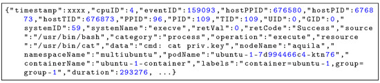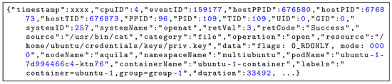 To illustrate the raw telemetry collected by Aquila, Figure 5 and Figure 6 show representative event log entries captured during the execution of the cat command accessing a sensitive file. Each event record is serialized in JSON format and consists of several attribute groups. The process context includes identifiers such as PID, TID, PPID, and host-level IDs to reconstruct process ancestry and execution chains. System call information contains the system call name, its arguments, return code, and execution duration, providing low-level visibility into kernel activities. The resource access metadata specifies the operation type (e.g., open, execute), the accessed resource path, and any access flags used. The container and orchestration context adds Kubernetes namespace, pod, container name, and user-defined labels for workload attribution, while node information records the hostname and CPU core ID for correlating events with placement and scheduling decisions. This structured format enables accurate correlation between process activities, system calls, container workloads, and orchestration layers, supporting multi-dimensional security analysis.