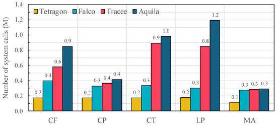 System call workloads were generated using the Phoronix OSBench suite [26], which provides microbenchmarks for core kernel activities such as file creation, process and thread creation, program launches, and memory allocation. Each benchmark was executed ten times, and the average per-event processing time was recorded directly from OSBench outputs. The total number of system calls captured by each framework was computed from the corresponding log files under uniform logging configurations.