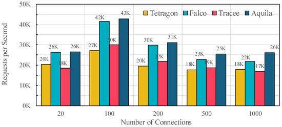 Finally, Table 6 reports the maximum network throughput measured under constant load. Aquila sustains 21.95 Gbps, slightly higher than Falco (21.70 Gbps) and significantly ahead of Tracee (13.98 Gbps) and Tetragon (12.40 Gbps), confirming that the architectural optimizations in Aquila improve both dynamic and steady-state service performance.