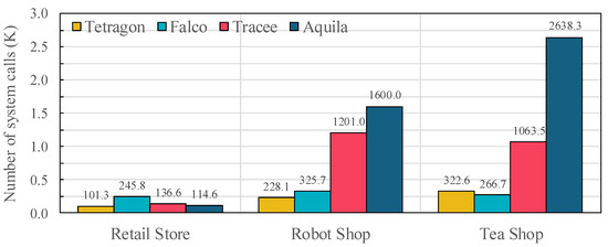 Number of system call events processed under microservice workloads (Retail Store, Robot Shop, TeaShop) across evaluated frameworks (Tetragon, Falco, Tracee, and Aquila).