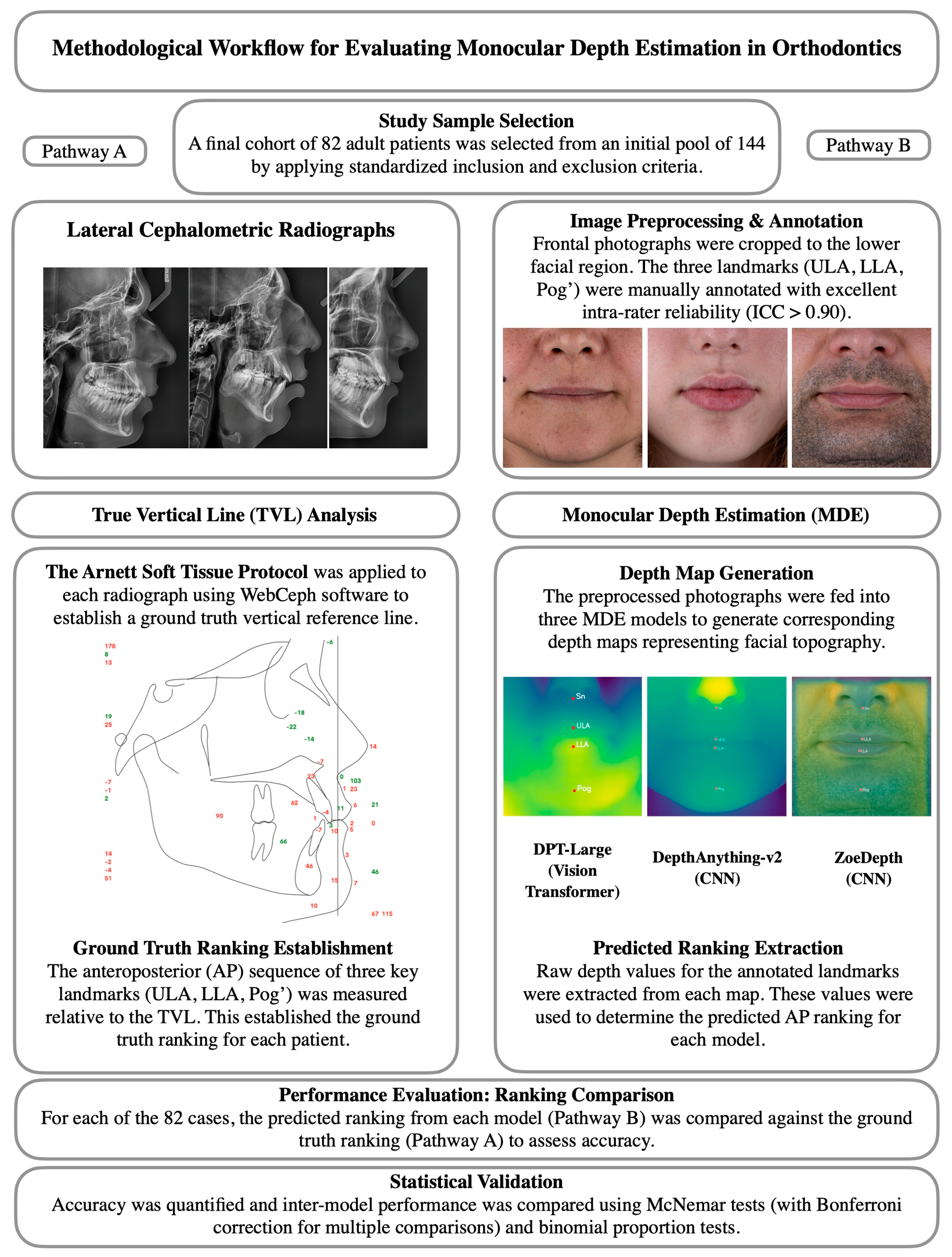 Ranking accuracy was defined as the proportion of cases in which a model’s predicted landmark order matched the TVL-based reference ranking. It was treated as a binary variable, where a prediction was classified as correct only when the model’s estimated anteroposterior order of the three landmarks (ULA, LLA, and Pog′) exactly matched the reference order obtained from the lateral cephalometric TVL analysis. Any deviation from this sequential order, including partial matches, was considered incorrect. No numerical tolerance or margin of error in relative depth values was applied; the evaluation was strictly based on ordinal ranking. This stringent definition was adopted to assess each model’s capacity to produce clinically meaningful and unequivocal anteroposterior relationships, since even minor ranking inconsistencies could alter diagnostic interpretation in orthodontic practice. For DPT-Large, DepthAnything-v2, and ZoeDepth, mean accuracy, standard deviation, and range were calculated across the sample of 82 cases.
