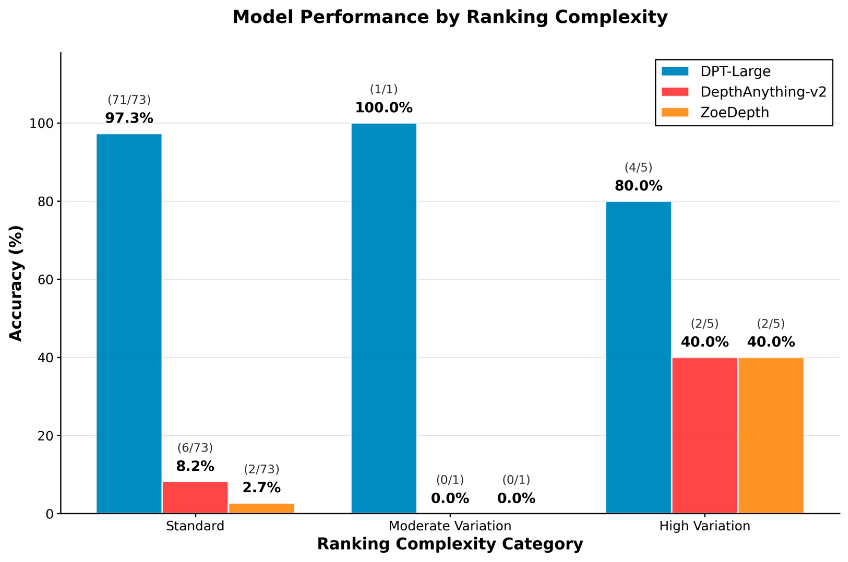 Figure 4, DPT-Large achieved consistently high accuracy across all categories, indicating robustness to anatomical variability. Conversely, DepthAnything-v2 and ZoeDepth exhibited uniformly poor performance, particularly under standard ranking conditions. Chi-square analyses confirmed significant associations between model type and prediction accuracy (χ