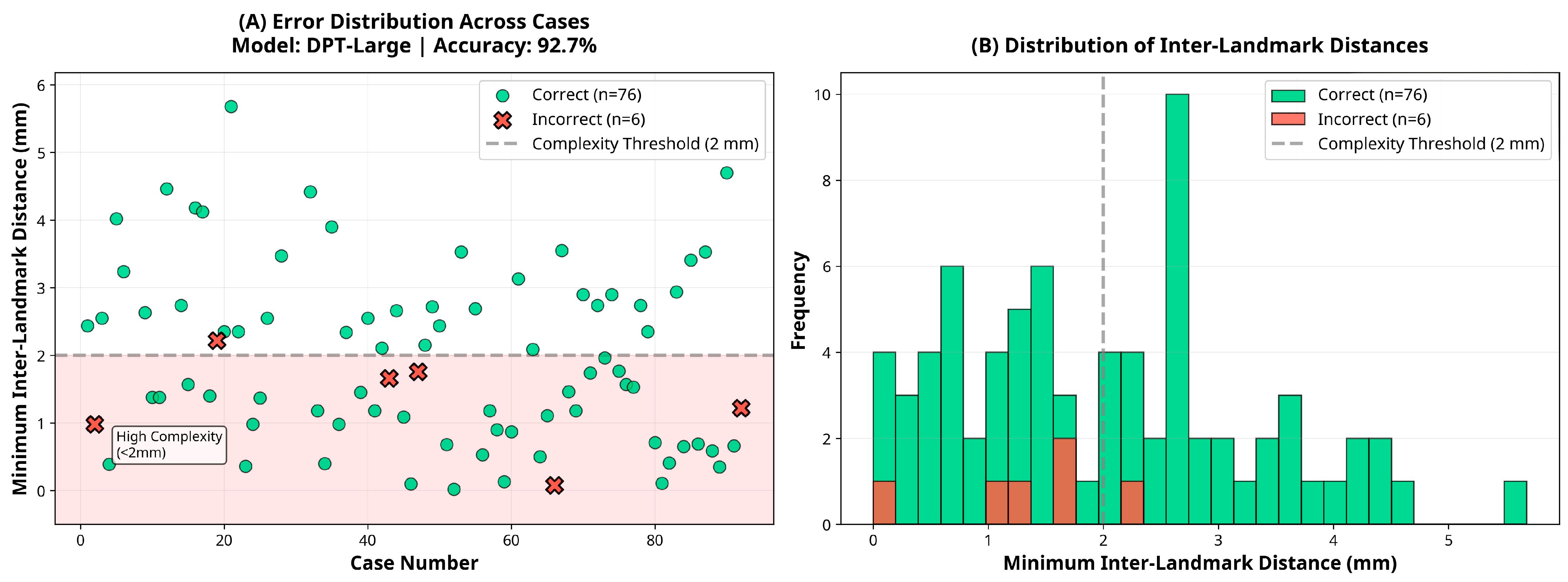 Subgroup analysis revealed that the DPT-Large model’s performance varied slightly according to ranking complexity. Among the 38 cases classified as low complexity (inter-landmark distance ≥2 mm), the model achieved an accuracy of 97.4% (95% CI: 86.2–99.9). In contrast, among the 44 high-complexity cases (inter-landmark distance <2 mm), accuracy was 88.6% (95% CI: 75.4–96.2), representing an 8.7 percentage point reduction. However, this difference did not reach statistical significance (χ2 = 1.19, p = 0.276), suggesting that although a trend toward reduced performance in high-complexity cases was observed, the model maintained robust accuracy across varying levels of task difficulty.