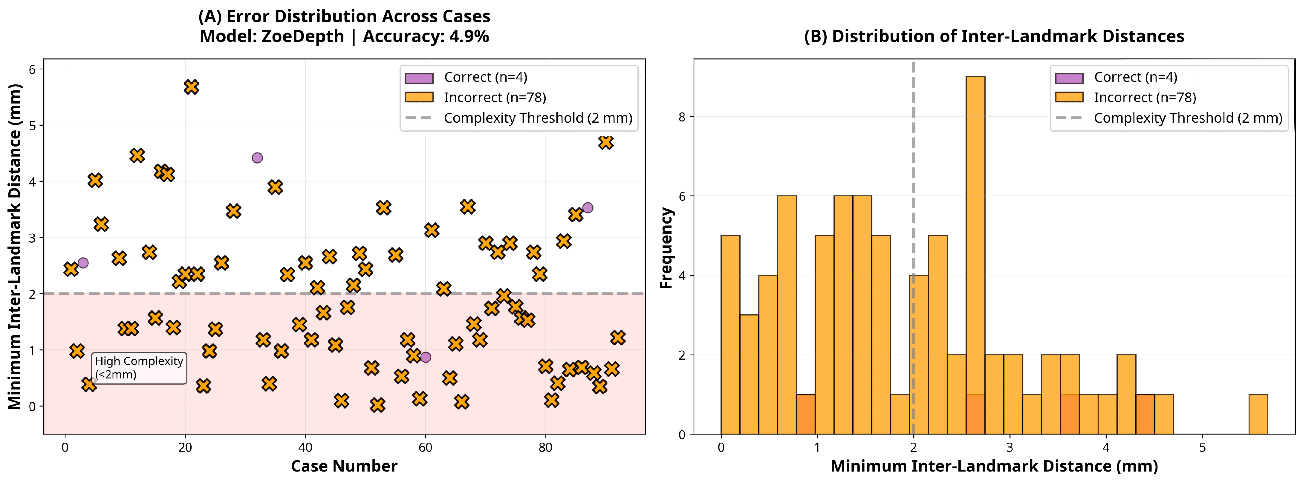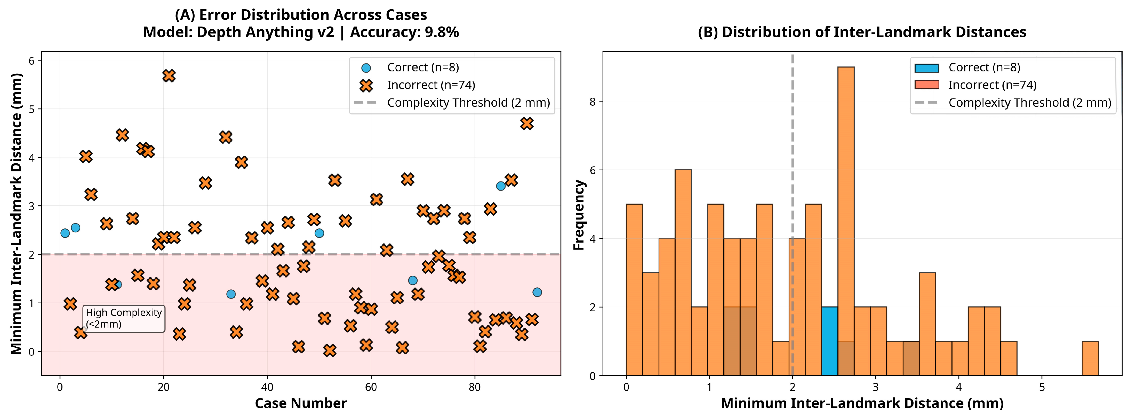 27]. These models were evaluated using publicly available pre-trained weights without domain-specific fine-tuning to ensure full reproducibility, which may have further limited their adaptation to facial morphology. These shortcomings were particularly evident in standard anteroposterior landmark configurations, where DepthAnything-v2 and ZoeDepth reached accuracies of only 8.2% and 2.7%, respectively.