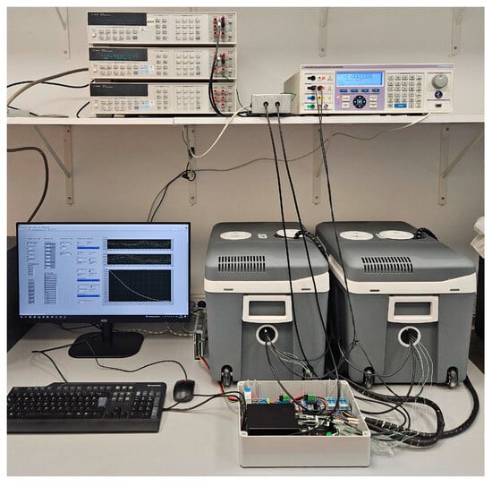 The experimental setup consisted of two thermoelectric chambers for temperature control, a customized relay switching unit, a precision current source and two high-precision digital multimeters, all coordinated by a higher-level LabVIEW application, with the CR1000X data logger (Campbell Scientific, Inc., Logan, UT, USA) providing temperature control and stability monitoring.