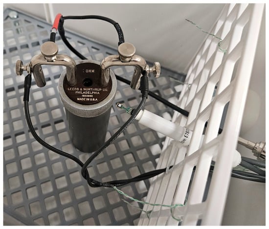 The air temperature is monitored by a combination of a HygroVUE5 sensor (Campbell Scientific, Inc., Logan, UT, USA) and four thermocouples in each chamber (Figure 2). The HygroVUE5 [9] is positioned in the center of the chamber near the device under test and provides a calibrated and accurate reference measurement. The thermocouples are type K, with the junctions welded to a single point of very low thermal mass. This design minimizes thermal inertia and reduces response time, allowing the thermocouples to detect rapid fluctuations in air temperature. The sensors are arranged in a two-by-two matrix around the device under test, with two at one-third and two at two-thirds of the device height and distributed laterally on the left and right sides of the chamber. This configuration enables the detection of vertical and horizontal gradients while providing responsive data for control.