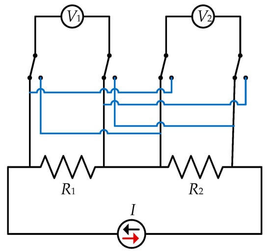 In the dual voltmeter, dual chamber configuration, the Transmille calibrator provided current excitations across two resistors, and , while voltage drops were measured simultaneously using two 3458A digital multimeters and (Figure 3). The relay box allowed the channels to be swapped so that both voltmeters measured each resistor in turn. In addition, the current polarity was reversed to compensate for thermal EMF effects.