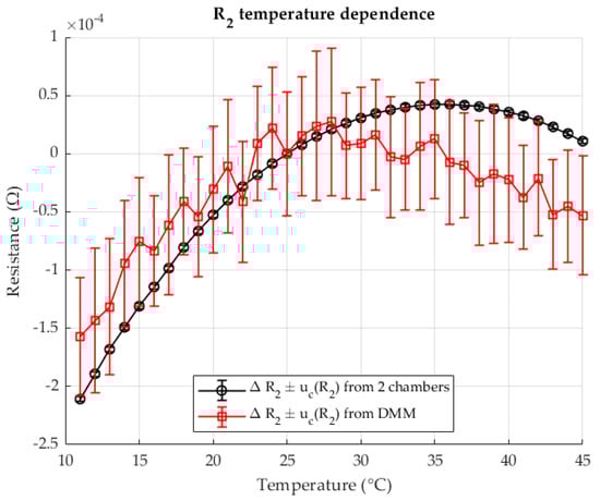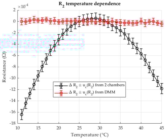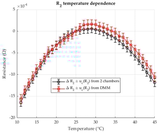 Figure 14 shows the change in resistance in chamber 2 as a function of temperature. The results are given both for the two-chamber method and for the direct resistance measurement with a DMM in four-wire configuration. All resistances are given as deviations (ΔR) relative to the reference resistance at 23 °C.