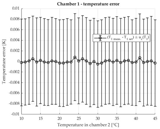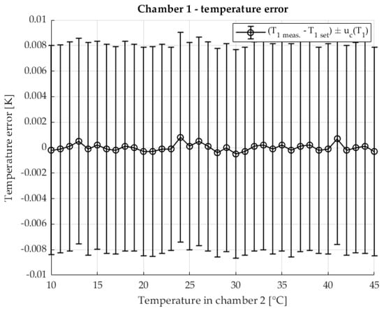 The temperature stability in chamber 1 is shown in Figure 6 The error of the measured temperature inside the chamber in relation to the set temperature is shown. The measurement uncertainty of the temperature is also shown. The temperature range corresponds to the temperature range at which the TCR shunt was measured.