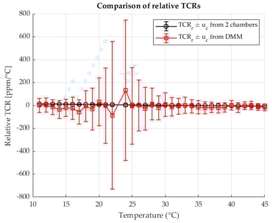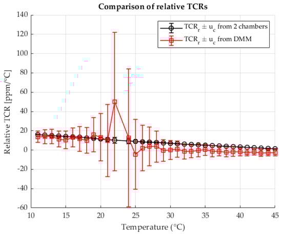 Relative TCRs calculated from for the two-chambers method (black) and the four wire DMM measurement (red). Resistance ratio r = 0.1 .