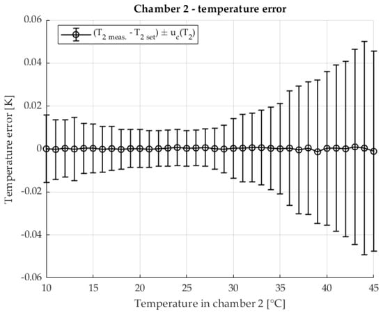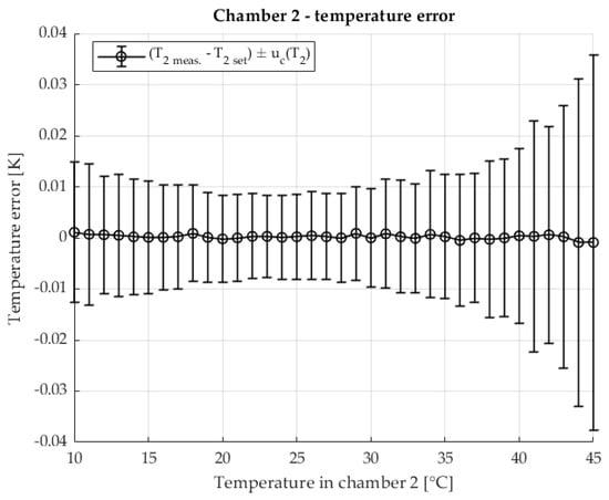The temperature stability of chamber 2, in which the device under test is located, is shown in Figure 12 The measured chamber temperature is shown as a deviation from the setpoint value with the corresponding measurement uncertainties.