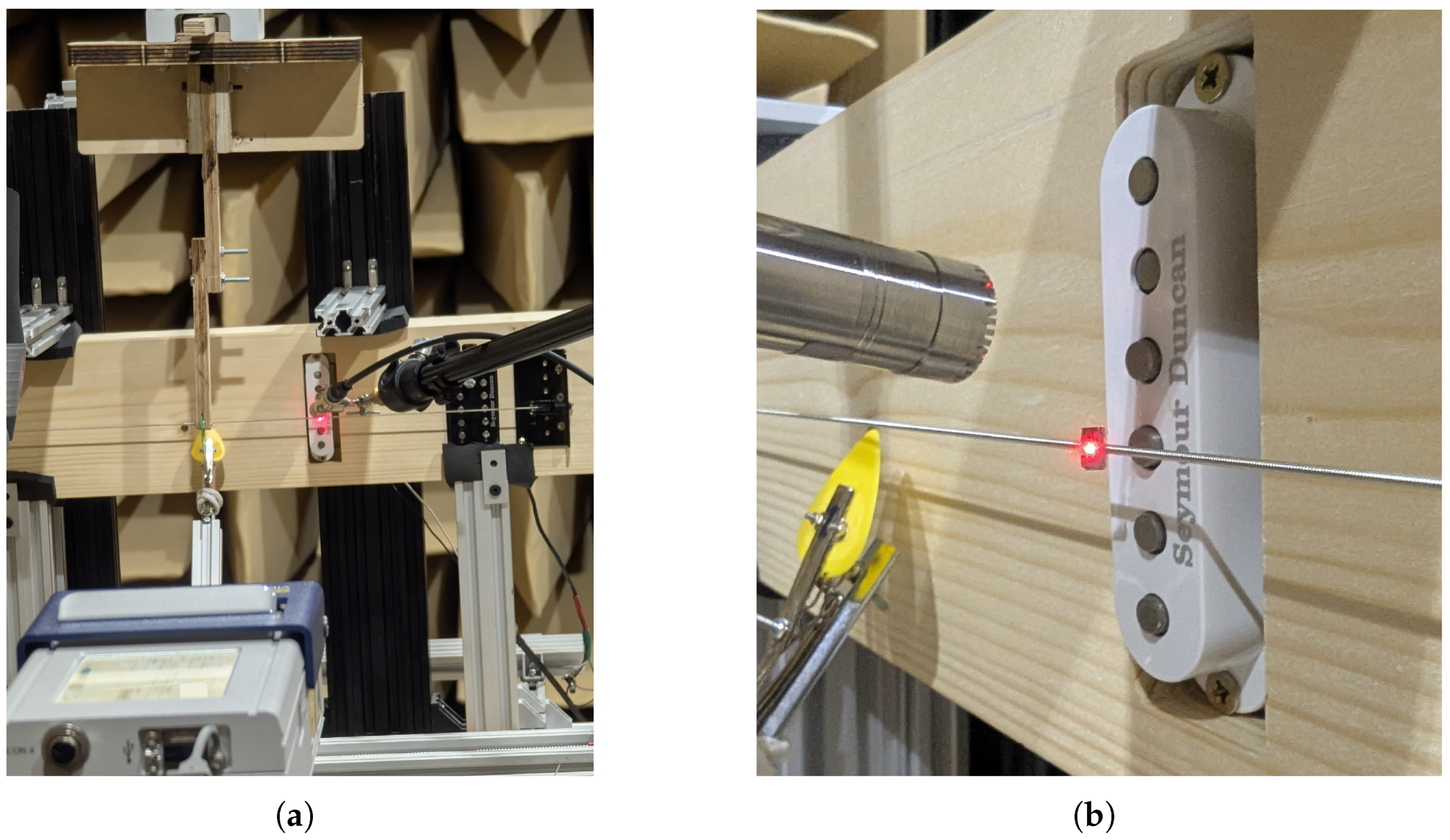The final measurement method utilized electromagnetic pickups mounted in the simplified electric guitar. Two pickups were used as follows: a single-coil Seymour Duncan SSL-5L and a humbucker Seymour Duncan SH-4 JB (Seymour Duncan, Santa Barbara, CA, USA). Both pickup configurations were employed to observe the differences in their measurement results. A humbucker consists of two coils wired in opposite polarity and positioned next to one another. This configuration cancels electromagnetic interference; however, its wider sensing aperture acts as a low-pass filter, averaging the string’s motion over a larger area, which typically corresponds to a warmer perceived tone. In contrast, a brighter, more articulate sound is typically associated with single-coil pickups. It is not feasible to mount both pickups in the same position and orientation; therefore, they were left in their separate mounting locations, and measurements were conducted over both pickups.