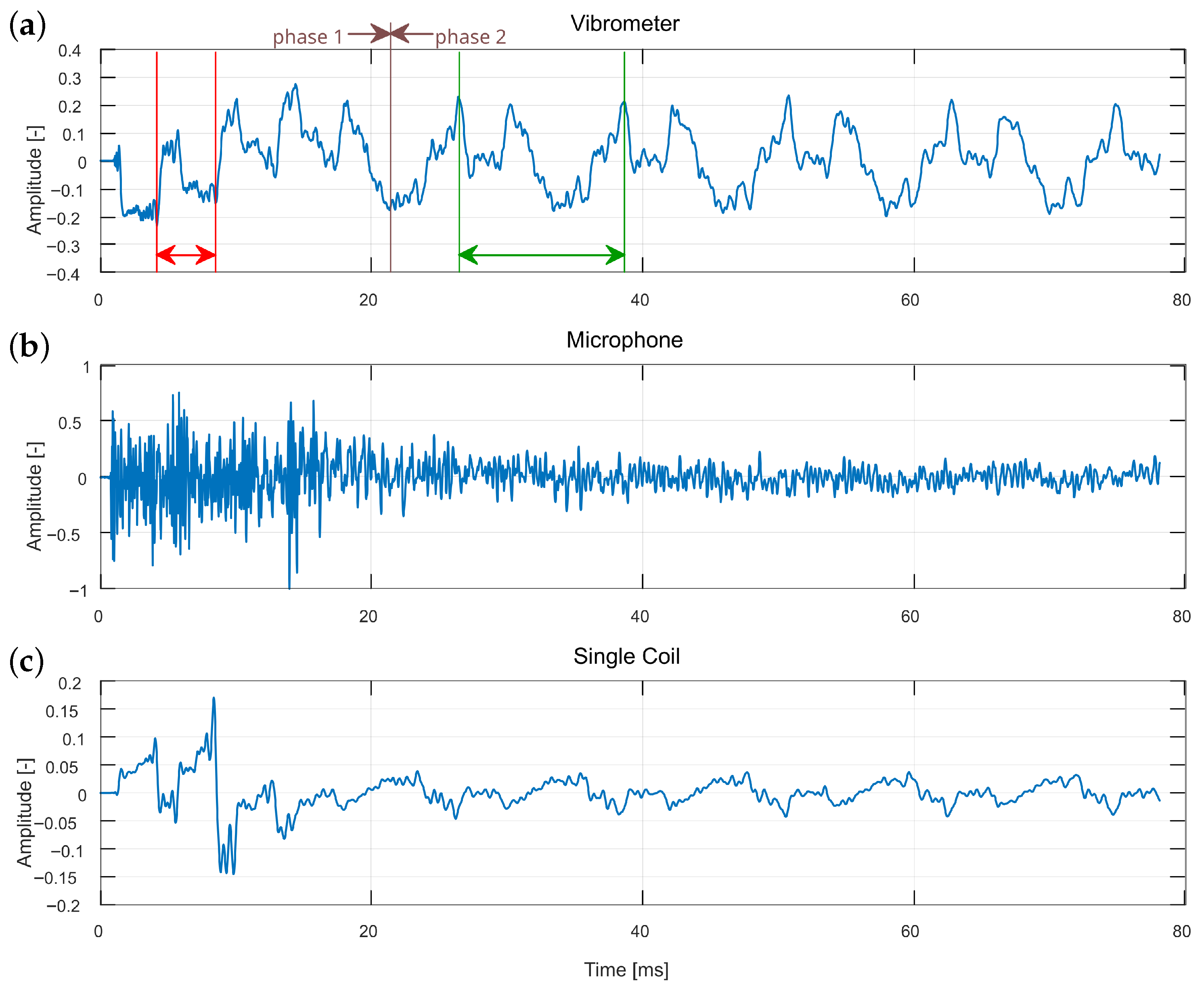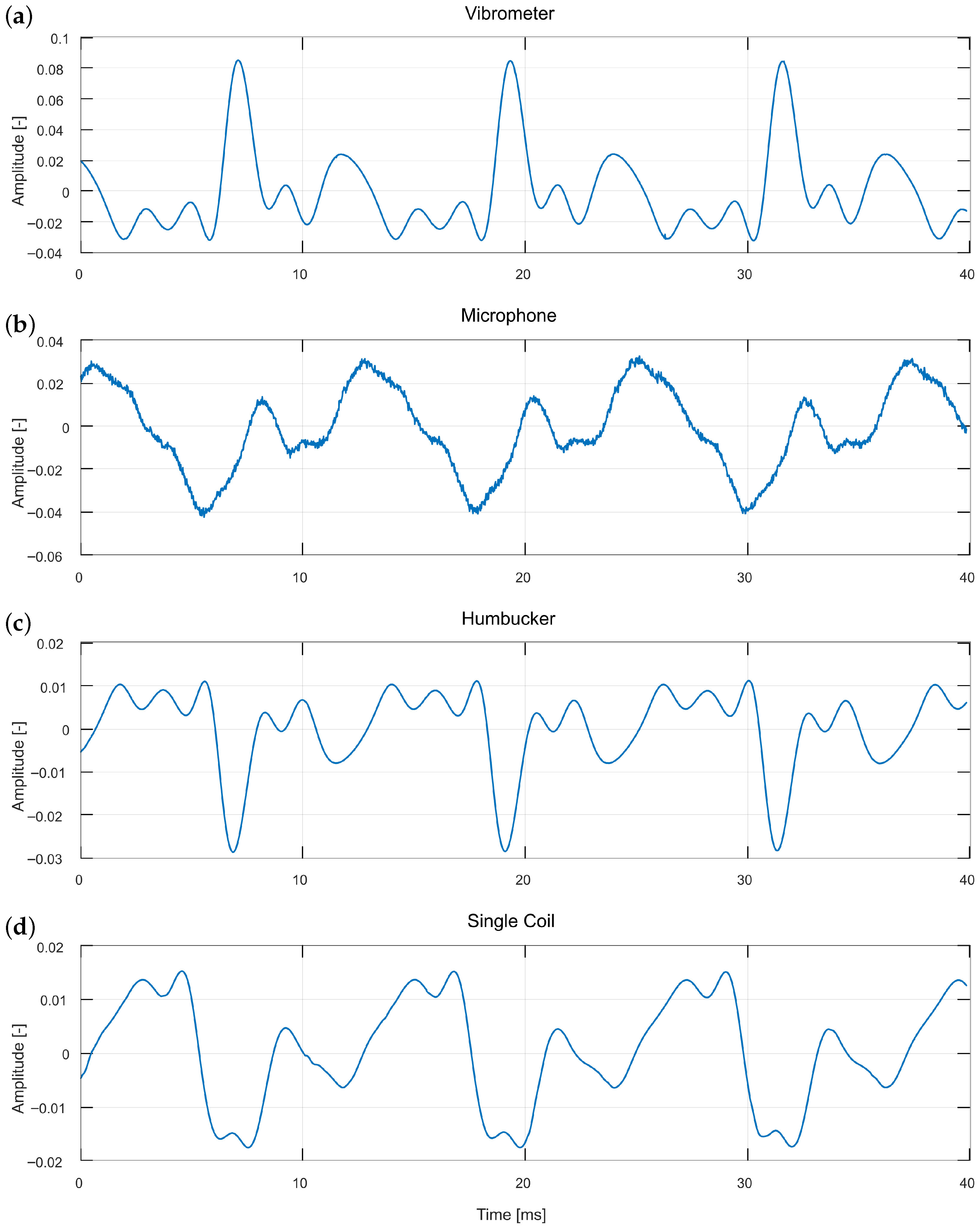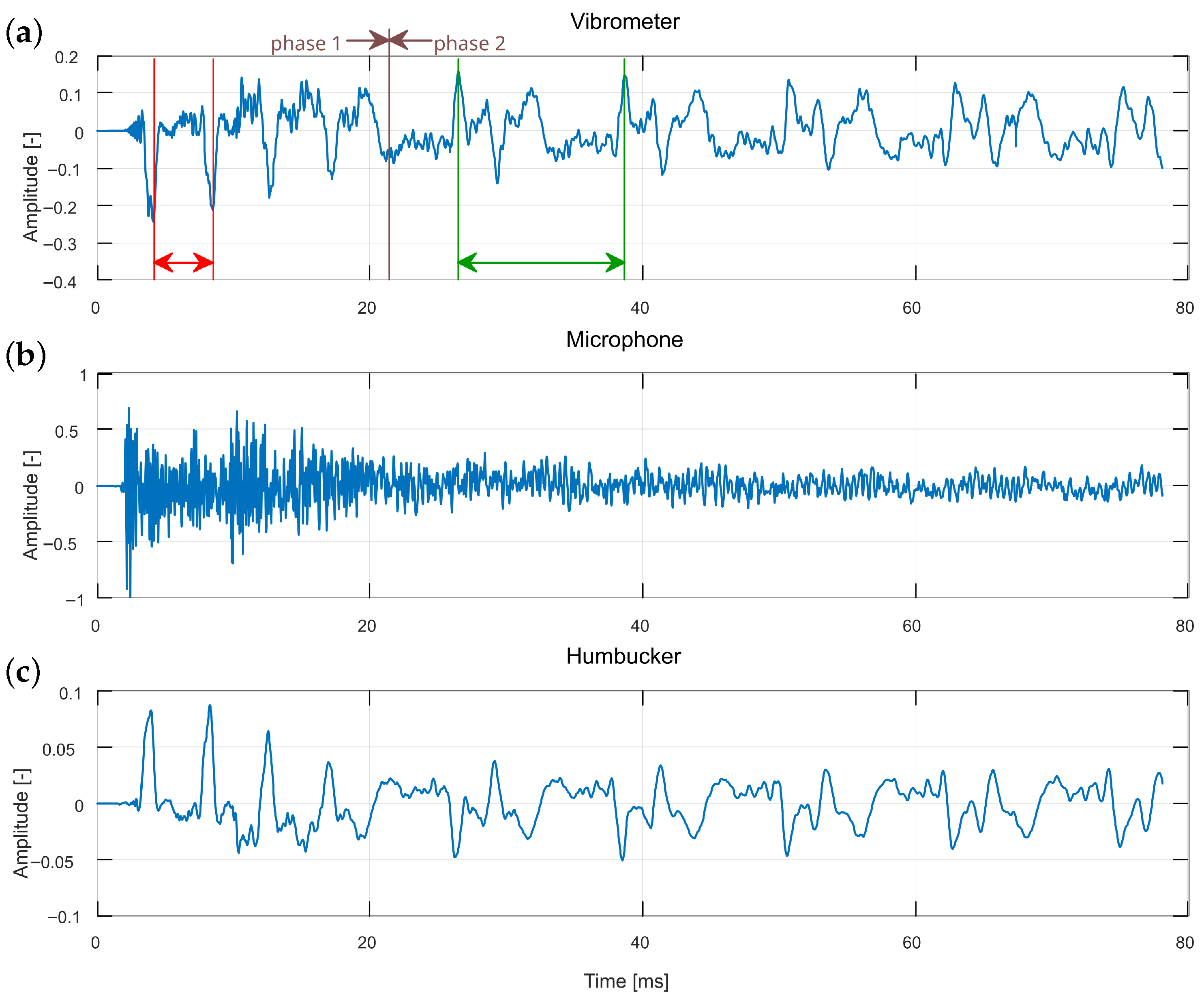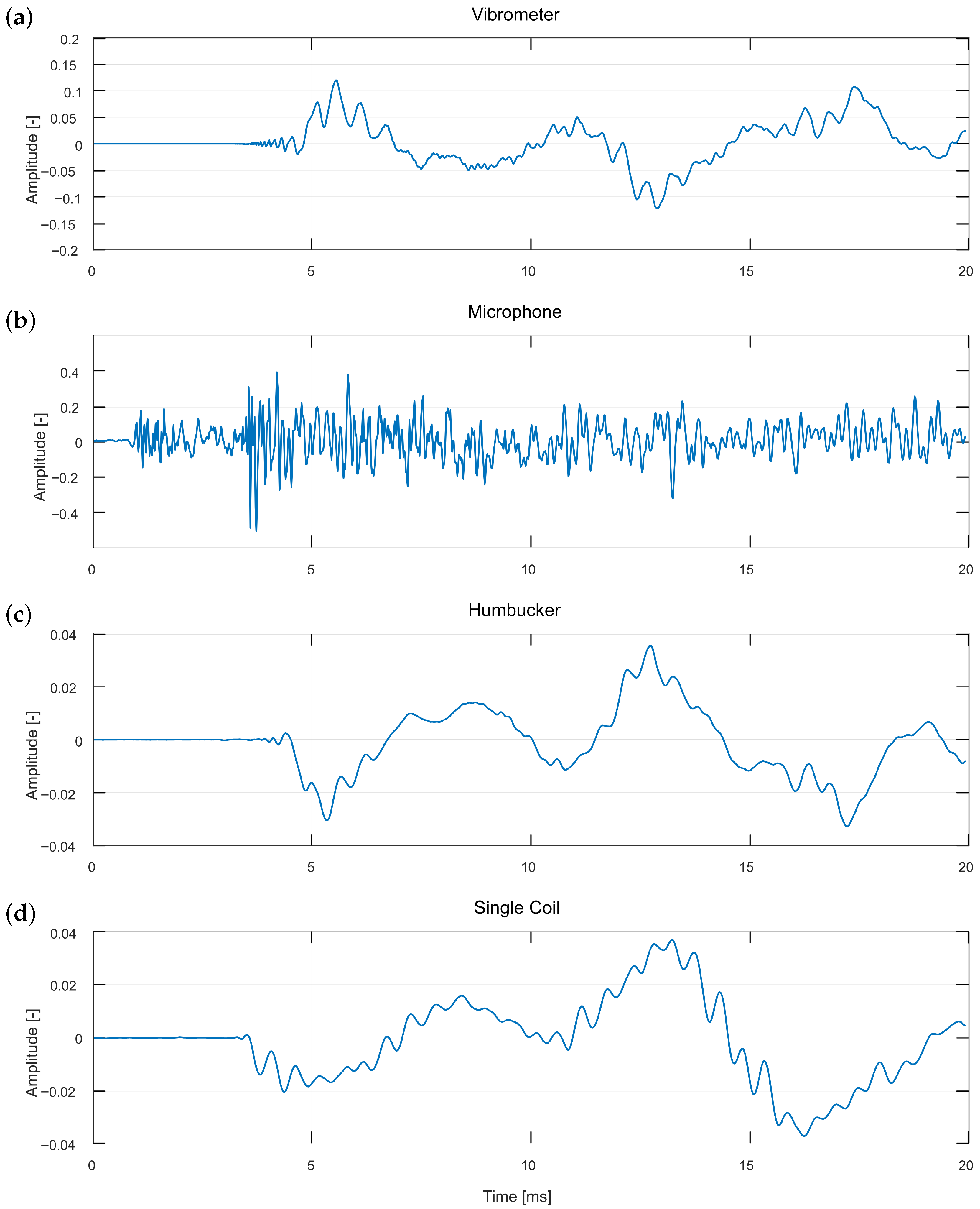 Figure 8) could influence the visibility of the phenomenon, the vibrometer consistently detected it at both positions. This indicates that the poorer performance of the single-coil pickup is attributable to the sensor characteristics rather than the measurement location.
