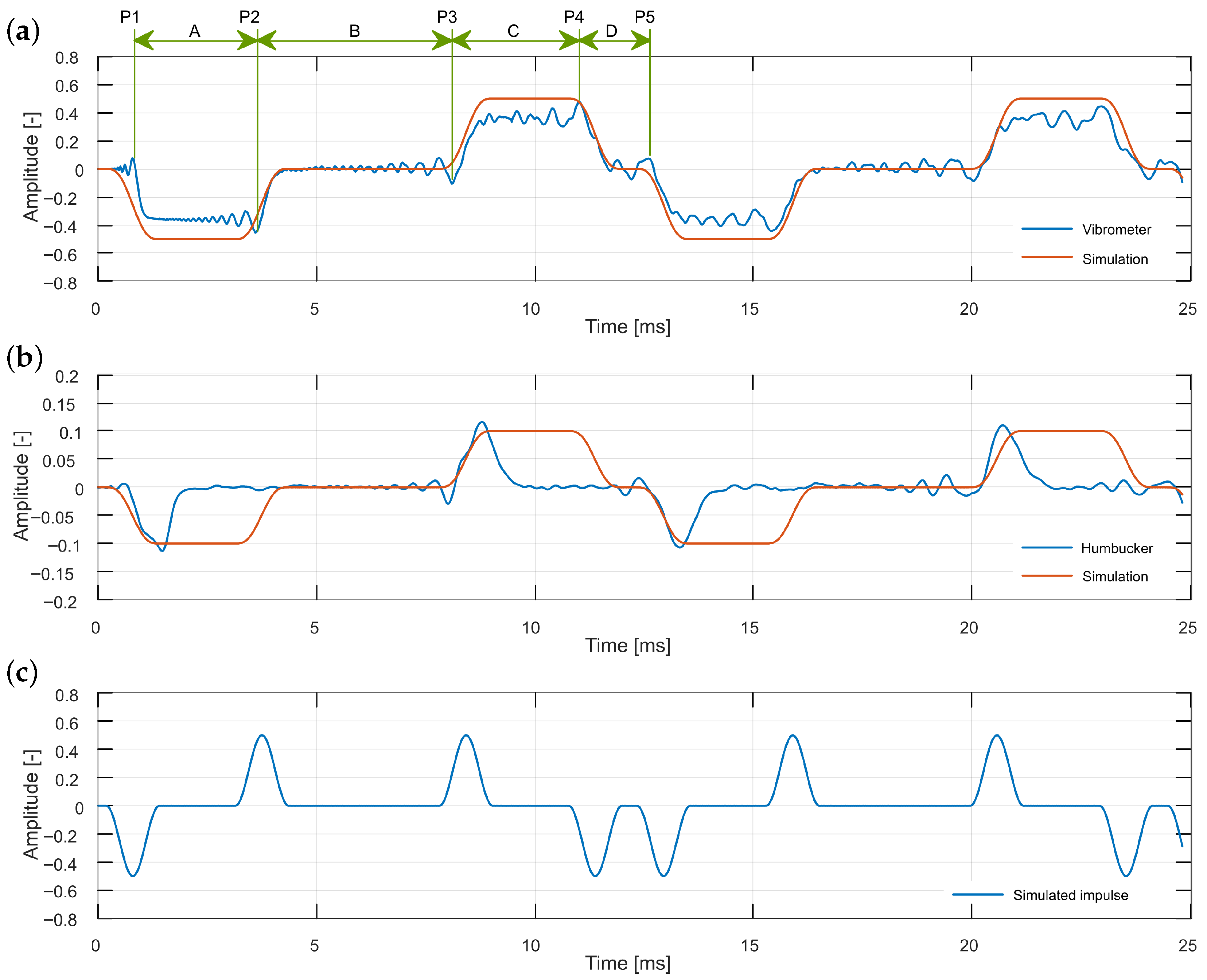 Figure 9) correspond closely with the simulation results, allowing straightforward identification of all traveling impulses along the string. The fine temporal detail captured by the vibrometer enables accurate measurement of inter-impulse distances, yielding the results presented in