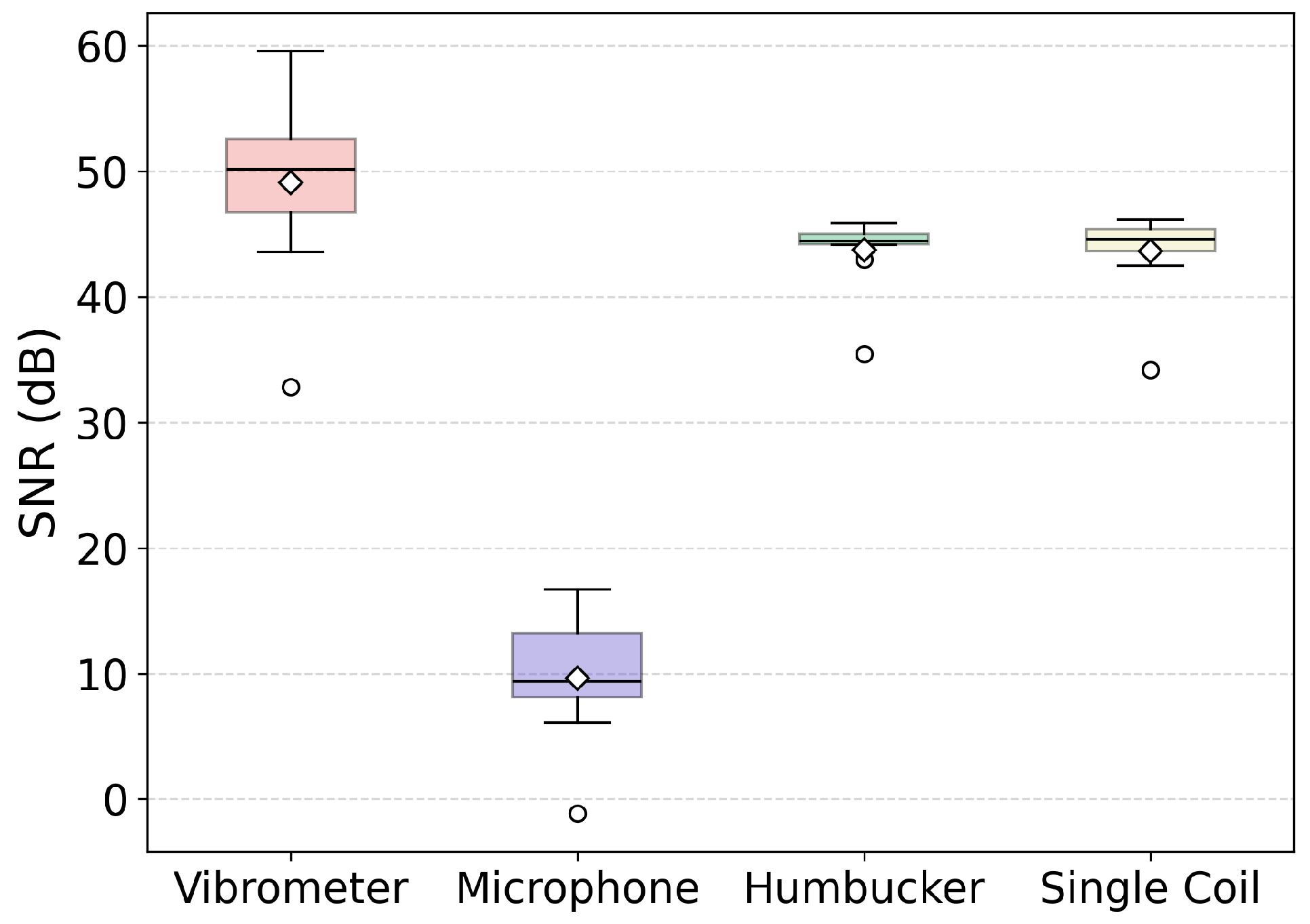 A few conclusions can be drawn from these results. The most important is the much lower values calculated for the microphone. This is due to two factors. Firstly, this reflects the inherently weak acoustic radiation of a single unamplified string in free air. Since the vibrating string is not amplified by any mechanical system, such as an acoustic guitar body, the signal level is low. Secondly, despite recording in an anechoic chamber, the microphone is still susceptible to noise generated by the operation of the plucking mechanisms. This shows the clear advantage of the optical and electro-acoustic methods in this experimental use case. The anechoic chamber provided both vibrational isolation and a low level of electric interference leading to high SNR values for these methods. The similar levels achieved by the single coil with 43.66 dB (SD = 2.9, N = 10) and humbucker with 43.74 dB (SD = 2.9, N = 10) suggest that the background electromagnetic interference was very low, rendering the interference cancellation provided by the humbucker unnecessary. Nonetheless, this factor should be considered when recording in less optimal environments. The highest SNR values were recorded for the vibrometer at 49.1 dB (SD = 6.9, N = 10); however, the advantage over the magnetic pickups was not substantial.
