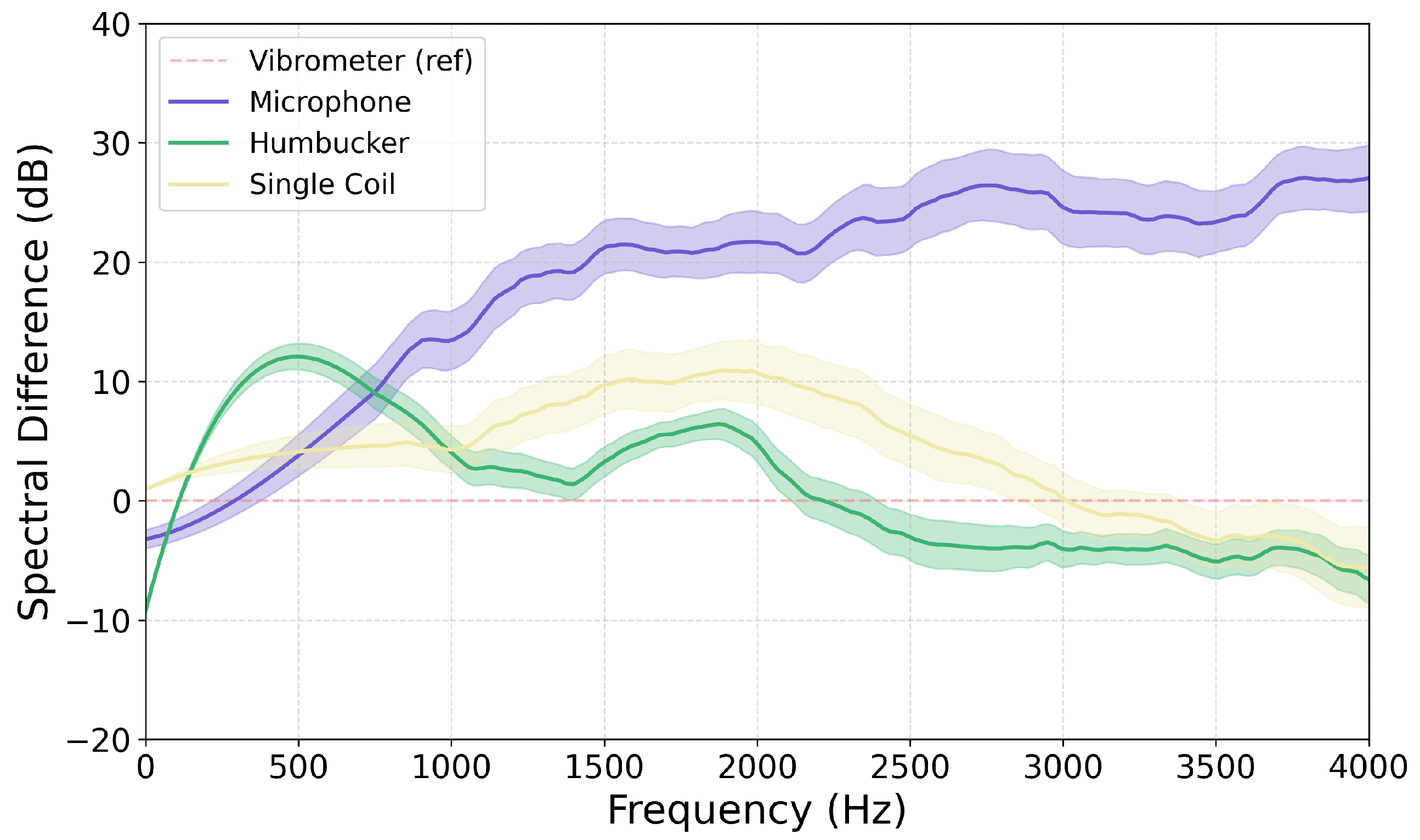 Magnetic pickups offer a pragmatic compromise. They are low-cost, easy to position reliably, and share the vibrometer’s immunity to ambient acoustic noise. However, they are susceptible to electromagnetic interference. They require ferromagnetic strings to function and, more importantly, act as inherent filters that influence the signal. No guitar pickups are designed for measurement purposes with a flat frequency response. Despite this, our measurement results show their ability to register precise waveform events at a level similar to the vibrometer.