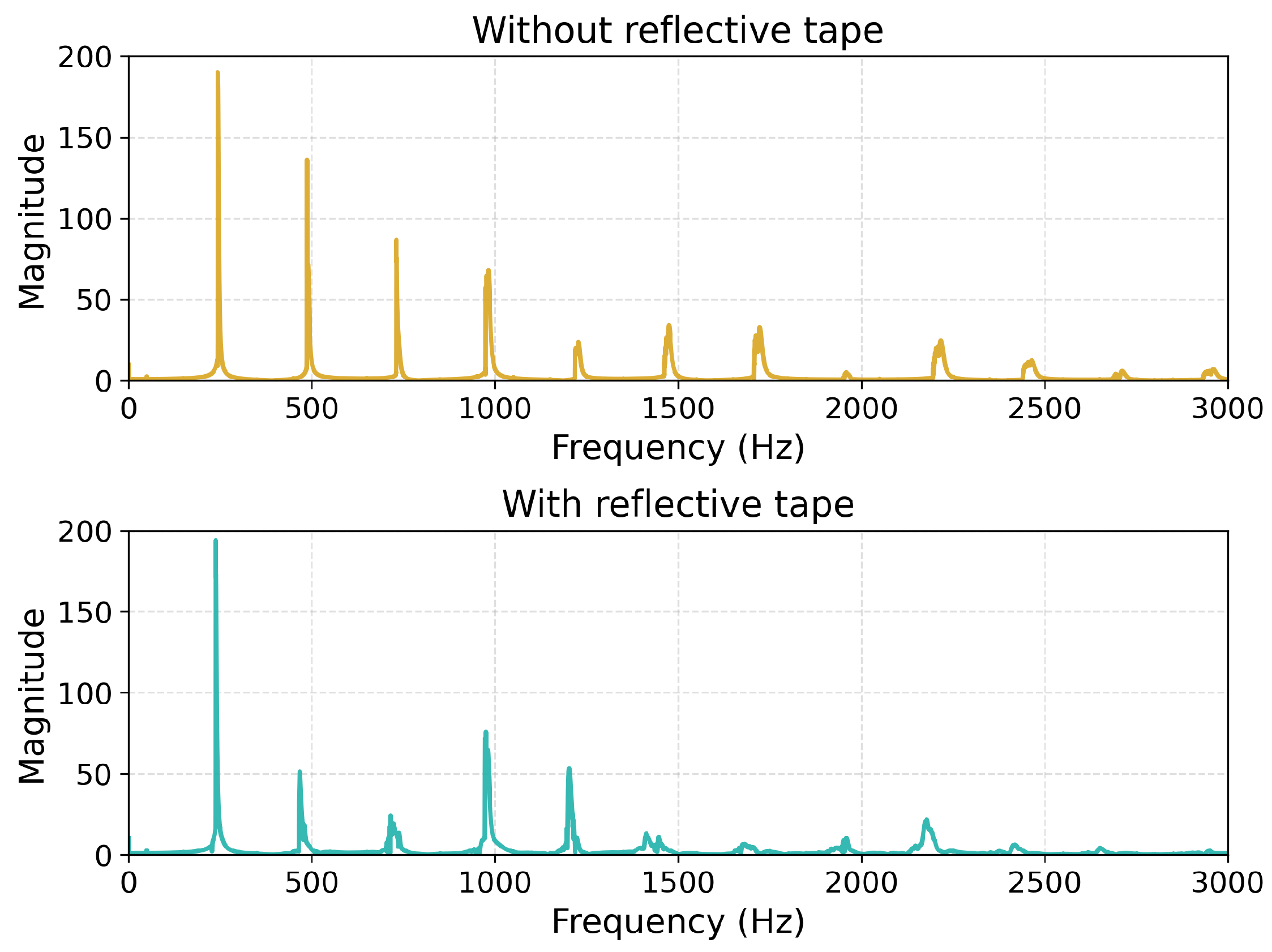 These results clearly illustrate the influence of the reflective sticker on string vibration. The differences are measurable and exceed the limits of perceptibility [
