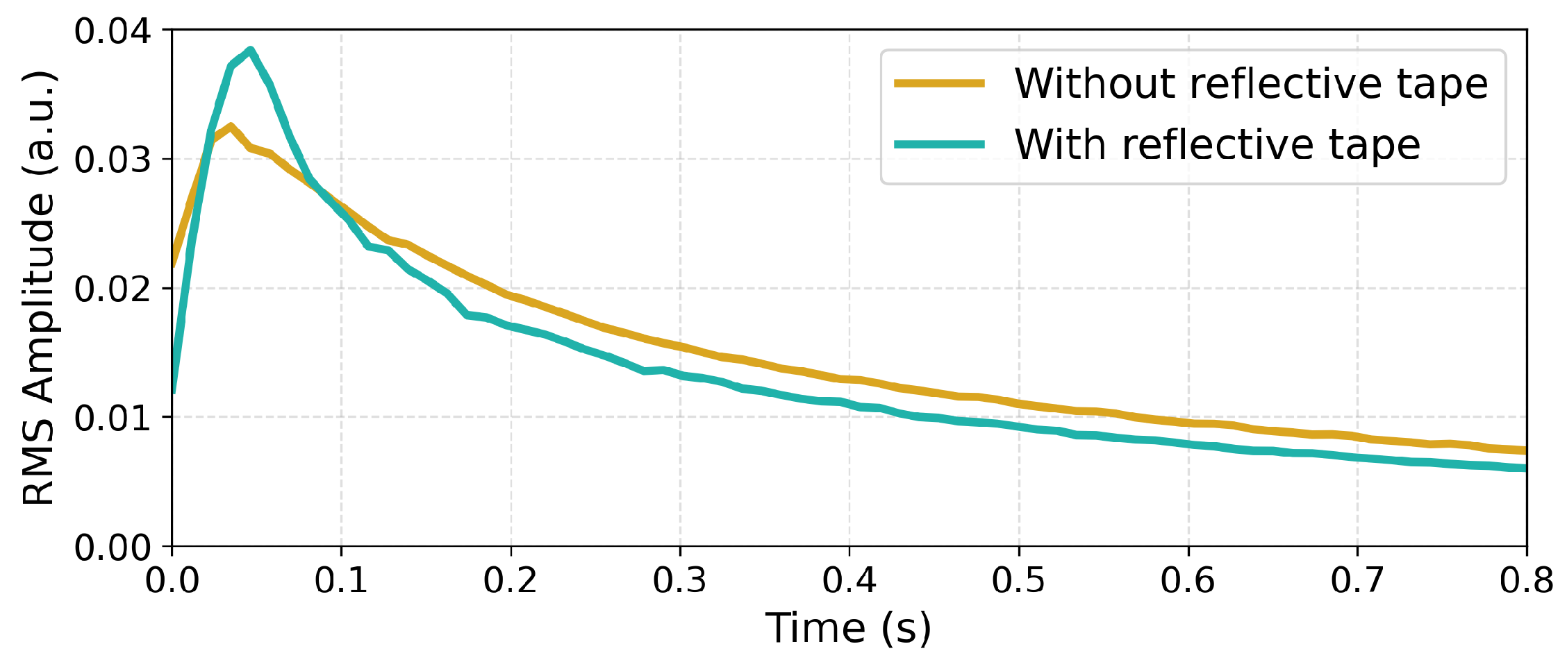 The influence of the sticker is clearly evident, resulting in significant damping of certain harmonics and amplification of others. This is particularly visible in the 400–800 Hz and the 1400–1800 Hz ranges. The impact is also visible in the time envelope of the recorded sound. A comparison of RMS envelopes is shown on