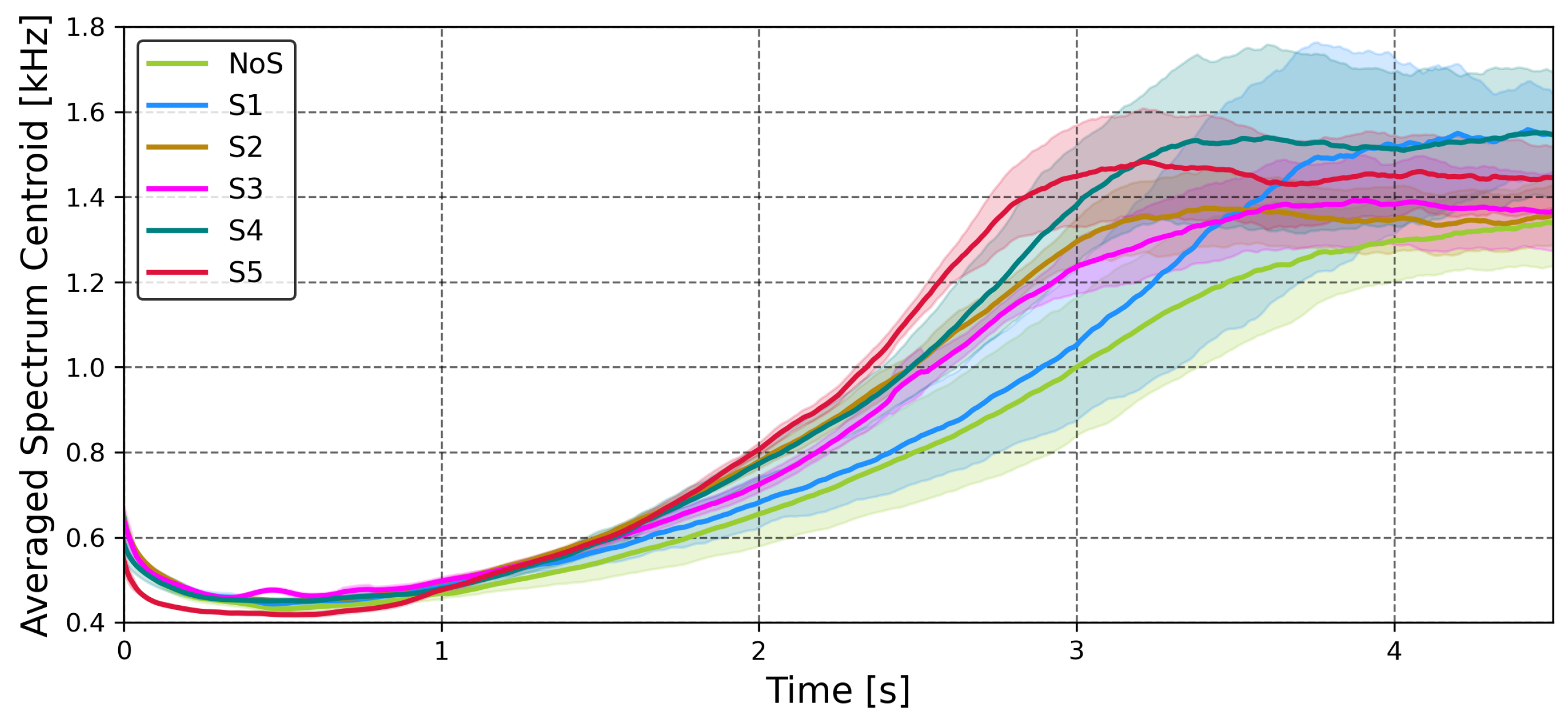 Figure 19 shows the change of spectral centroid over time for different stickers. Spectral centroid is an important parameter to investigate as it has been shown to highly correlate with listener perception of a sound’s brightness [