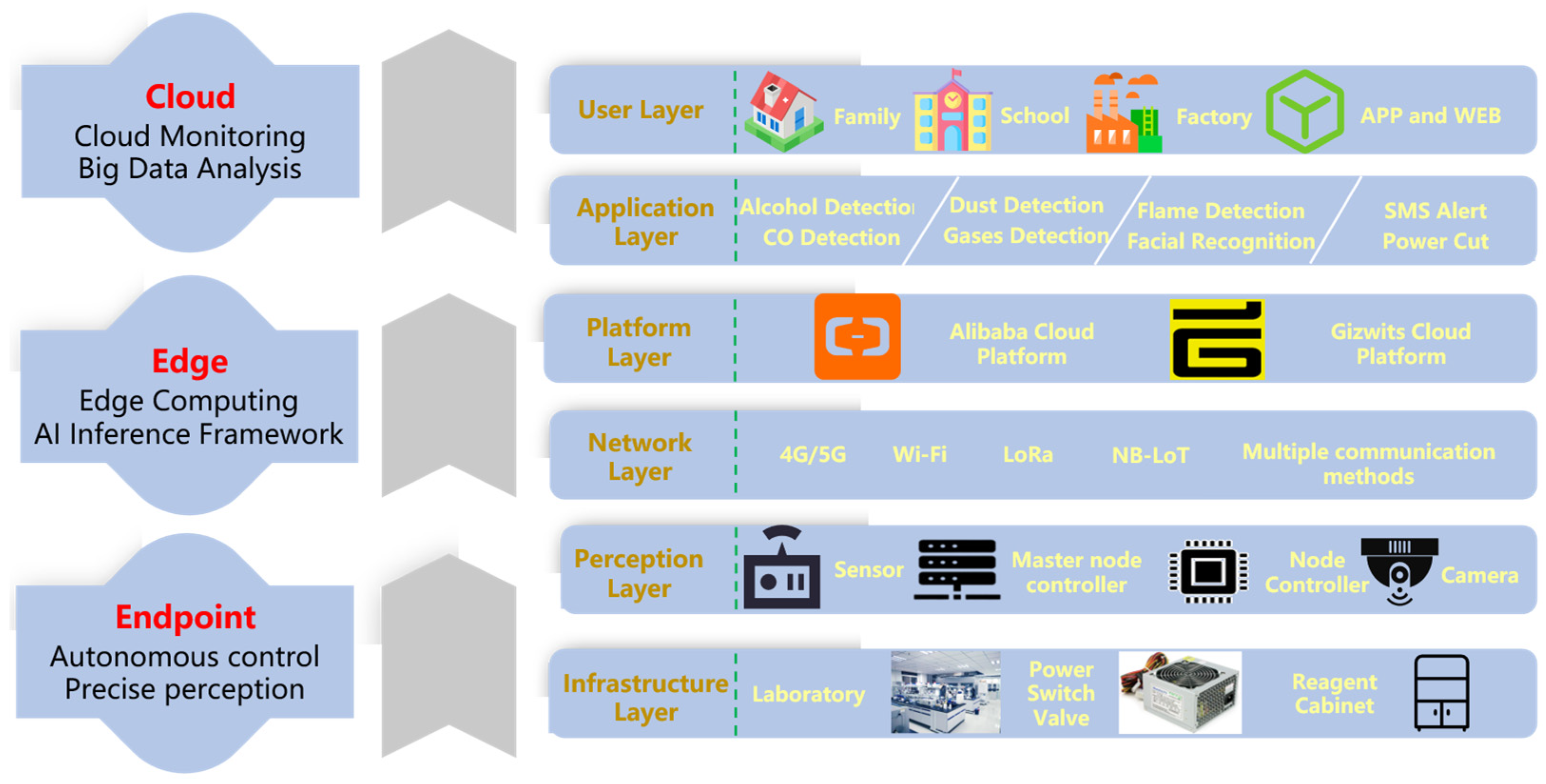 Figure 2 illustrates the layered design and data transmission process within the intelligent monitoring system. The bottom layer is the infrastructure layer, which includes physical settings such as laboratory environments, power switches, and reagent cabinets, providing the operational context for the system. Above this is the perception layer, composed of various sensors, master and sub-nodes, as well as camera devices, responsible for real-time environmental data acquisition and preliminary processing. The network layer ensures reliable data transmission through multiple communication technologies, including 4G/5G, Wi-Fi, LoRa, and NB-IoT, thereby supporting seamless interaction between layers. The platform layer, built upon Alibaba Cloud and Gizwits IoT platforms, manages cloud-based data access, storage, and intelligent processing. Furthermore, the application layer provides a range of functionalities tailored to diverse needs—such as alcohol and carbon monoxide detection, dust and sensitive gas monitoring, flame recognition, face recognition, SMS alerts, and power cutoff control—enabling multi-dimensional environmental and safety management. The topmost user layer serves practical application scenarios including homes, schools, and factories, and supports human–machine interaction via mobile APP and WEB interfaces.