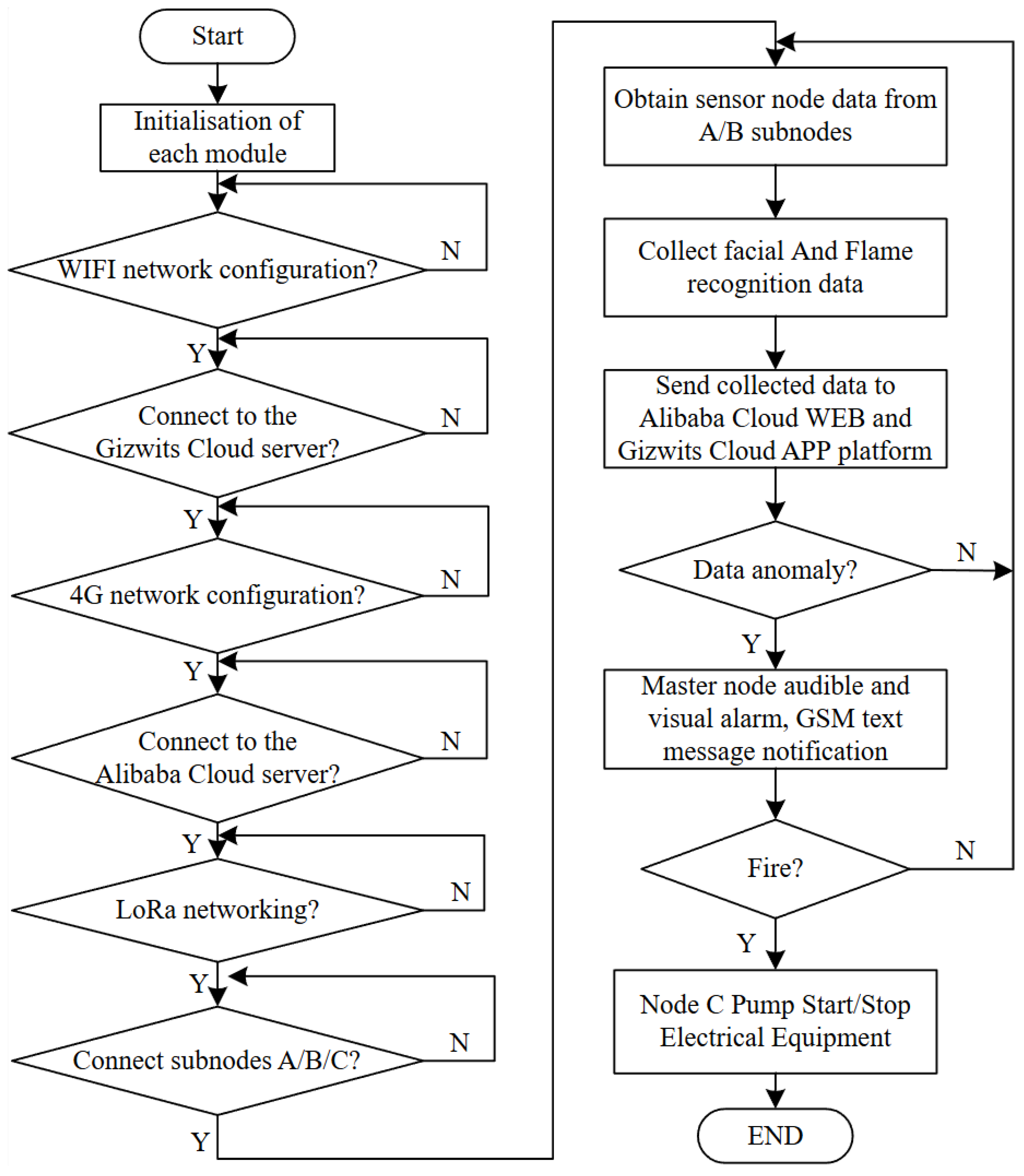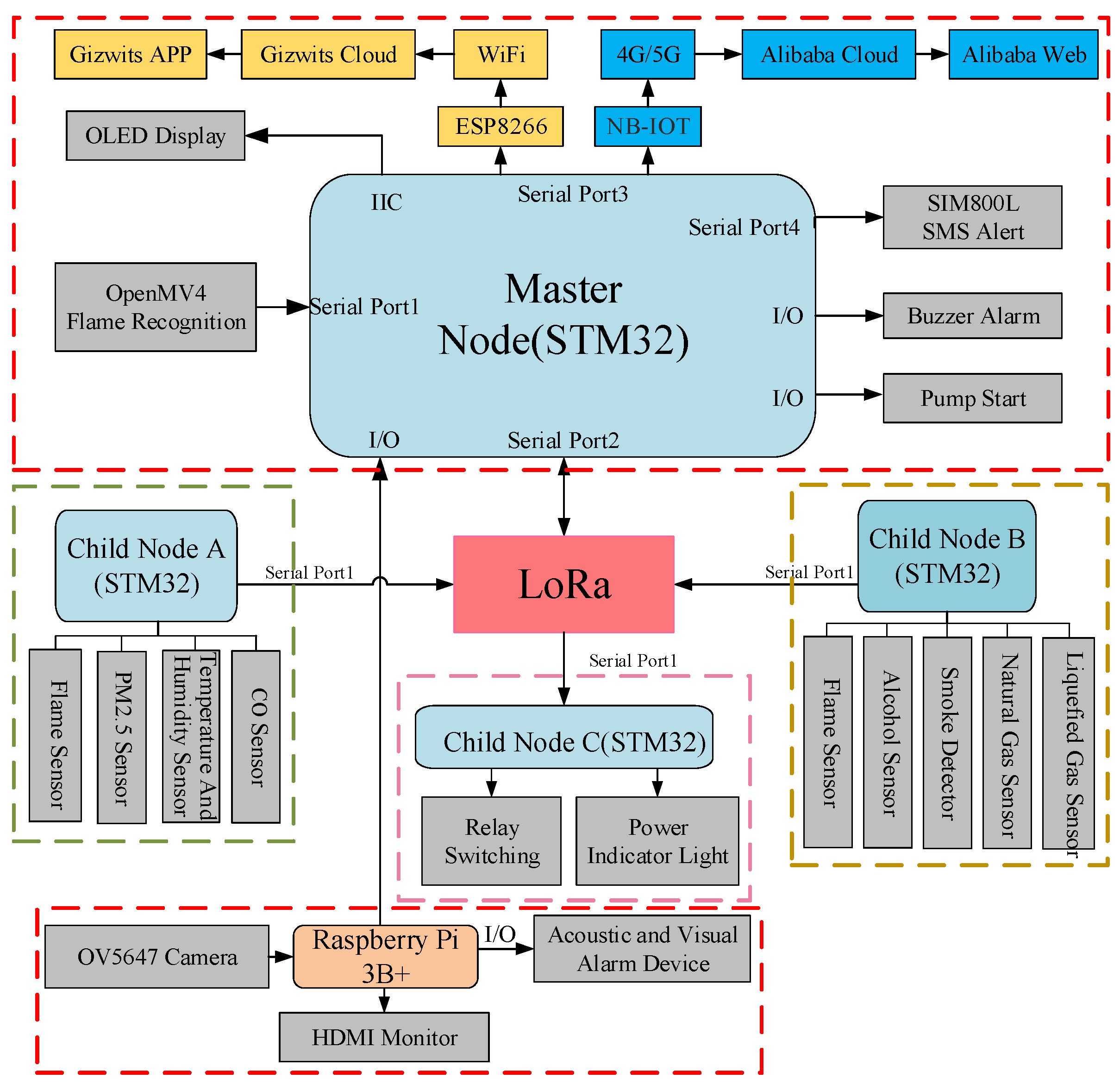 Figure 1, is designed to protect both personnel and property through a multi-node architecture comprising one master node and three sub-nodes connected via a LoRa wireless network. The master node, equipped with a Raspberry Pi for access control and an OpenMV module for visual fire detection, serves as the central hub for data processing and cloud communication. Environmental sensing nodes (A and B) collect real-time temperature, humidity, flame, alcohol, and carbon monoxide data and transmit it to the master node, which performs comprehensive analysis and uploads results to the cloud for remote monitoring. In response to detected risks, the actuation node (Node C) executes corresponding safety actions—such as alarms, power cutoff, SMS alerts, and water pump activation—thus forming a closed-loop safety management framework from perception to emergency response.
