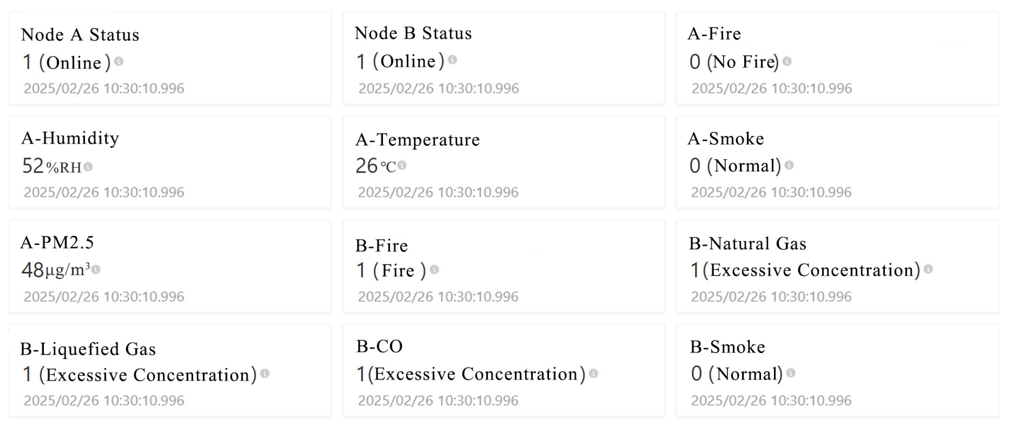 3—all within the normal range—while the A-Fire and A-Smoke indicators both show no fire and normal status. In contrast, Node B has detected multiple anomalies: the flame sensor identified a fire, and the concentrations of liquefied gas, natural gas, and carbon monoxide all exceed thresholds, triggering an “Excessive Concentration” alarm. This multi-dimensional data presentation method not only helps users intuitively track changes in the laboratory environment but also enables quick identification of potential risk sources.