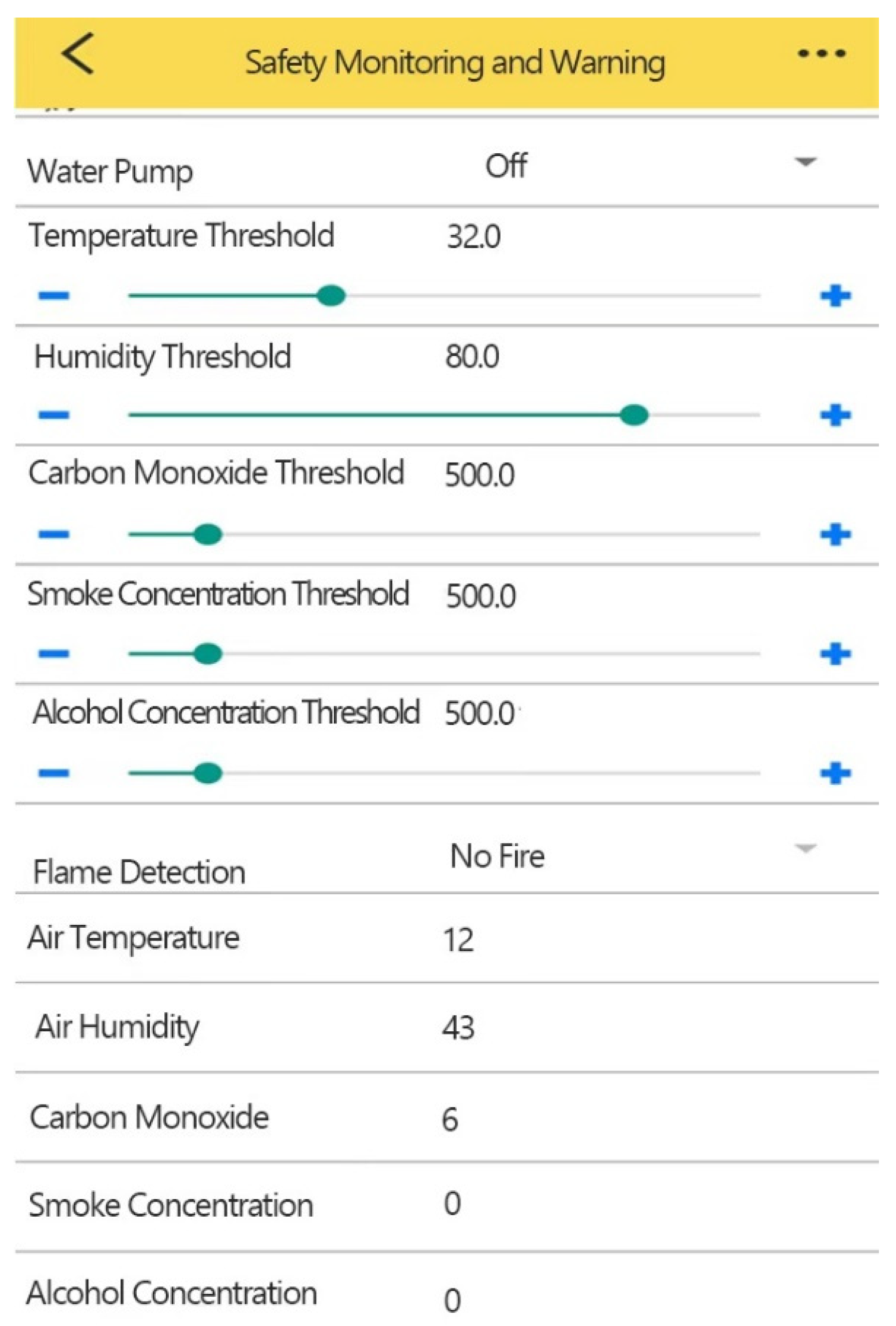 Figure 19 illustrates the laboratory safety monitoring interface of the Gizwits APP, designed to enable remote visualization and interactive control of the laboratory safety monitoring system. The interface consists of two main sections: a threshold configuration area and a real-time monitoring area. The upper section serves as the threshold configuration area, where users can flexibly adjust alarm thresholds for various sensors—such as temperature, humidity, carbon monoxide, smoke, and alcohol concentration—using sliders and “+”/“−” buttons. When an environmental variable exceeds the user-defined threshold, the system automatically triggers alarms or initiates coordinated responses, enabling intelligent protection of the laboratory environment. Additionally, this section provides manual on/off control of the water pump, allowing users to proactively intervene upon fire detection, thereby enhancing the timeliness and reliability of emergency response.