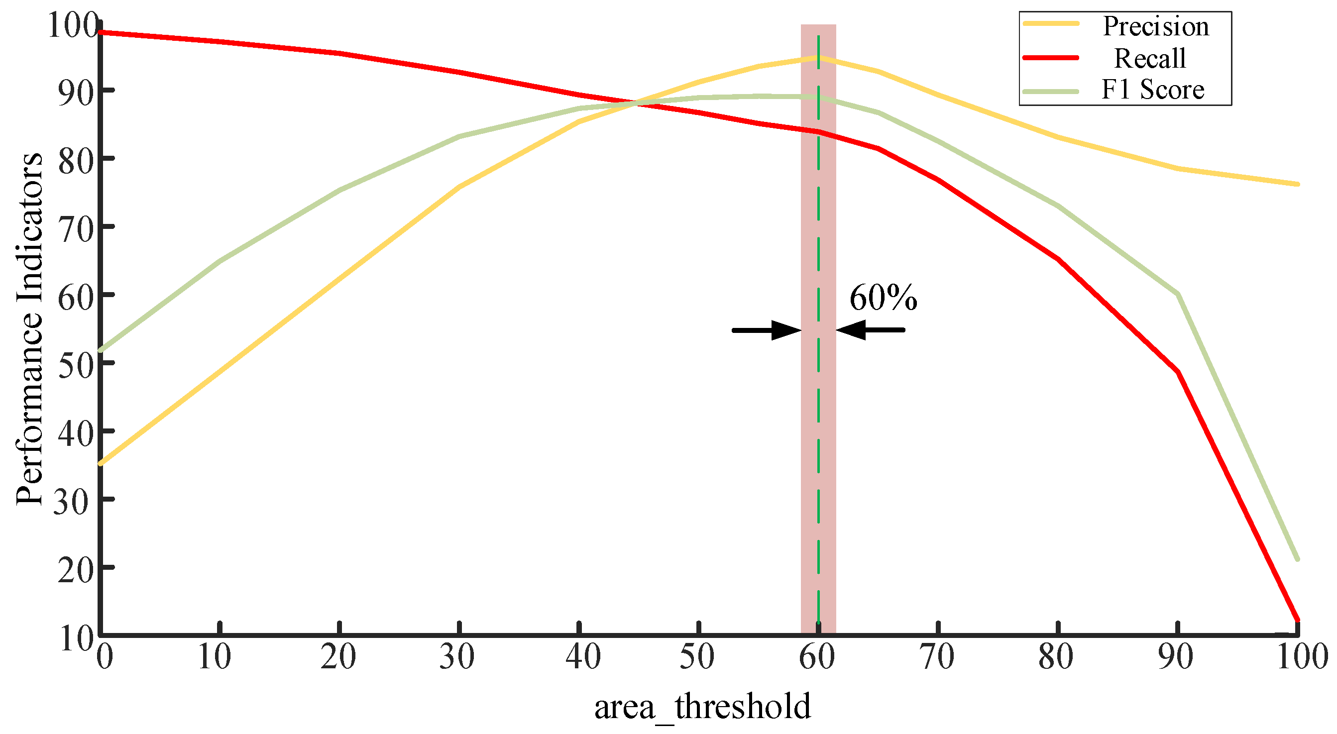 To quantitatively analyze the influence of the area threshold on algorithm performance, a systematic experiment was designed. Specifically, on a test set comprising approximately 100 flame samples and 400 non-flame samples, the area_threshold was incrementally adjusted within the range of 0 to 100. For each threshold value, the numbers of true positives (TP), false positives (FP), and false negatives (FN) were recorded, and the Precision, Recall, and F1 Score were calculated accordingly. This approach allows for a comprehensive evaluation of flame recognition performance under different thresholds and provides a quantitative basis for threshold optimization.