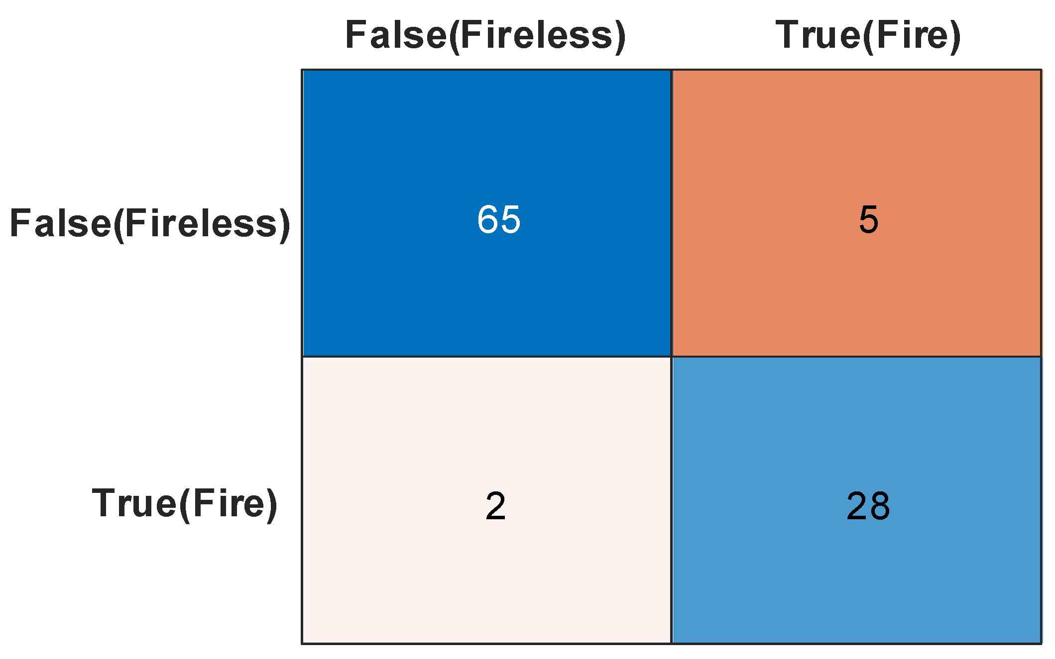 To better investigate the performance and error distribution of the system in flame recognition, this study employed a confusion matrix for quantitative analysis. As shown in