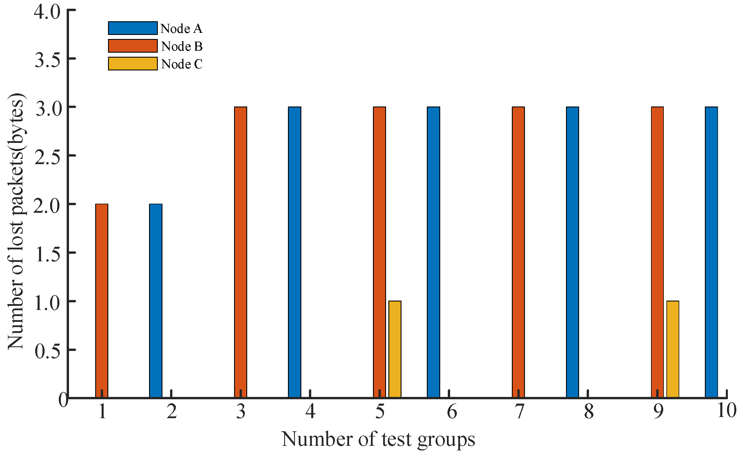 Table 7, Node A and Node B handled the majority of the data transmission tasks, with transmitted byte counts ranging from 105 to 198. Among them, Node B demonstrated the most stable performance, achieving zero packet loss across all five high-load test groups while maintaining a peak packet loss rate below 2.36%, indicating its reliable capability to handle high-volume data traffic. Although Node A also performed well overall, it exhibited minor fluctuations, with packet loss rates varying between 0% and 2.20%. It is noteworthy that Node C, which transmitted significantly fewer bytes (between 10 and 19), experienced relatively high packet loss rates of 7.69% and 5.88% in the fifth and ninth test groups—where the data volume was smallest (13 and 17 bytes, respectively). This phenomenon, while related to the small number of bytes transmitted, indicates that smaller data packets are more susceptible to environmental interference or contention mechanisms. This suggests that the system may have a bottleneck in processing minimal-sized packets or issues in priority scheduling.